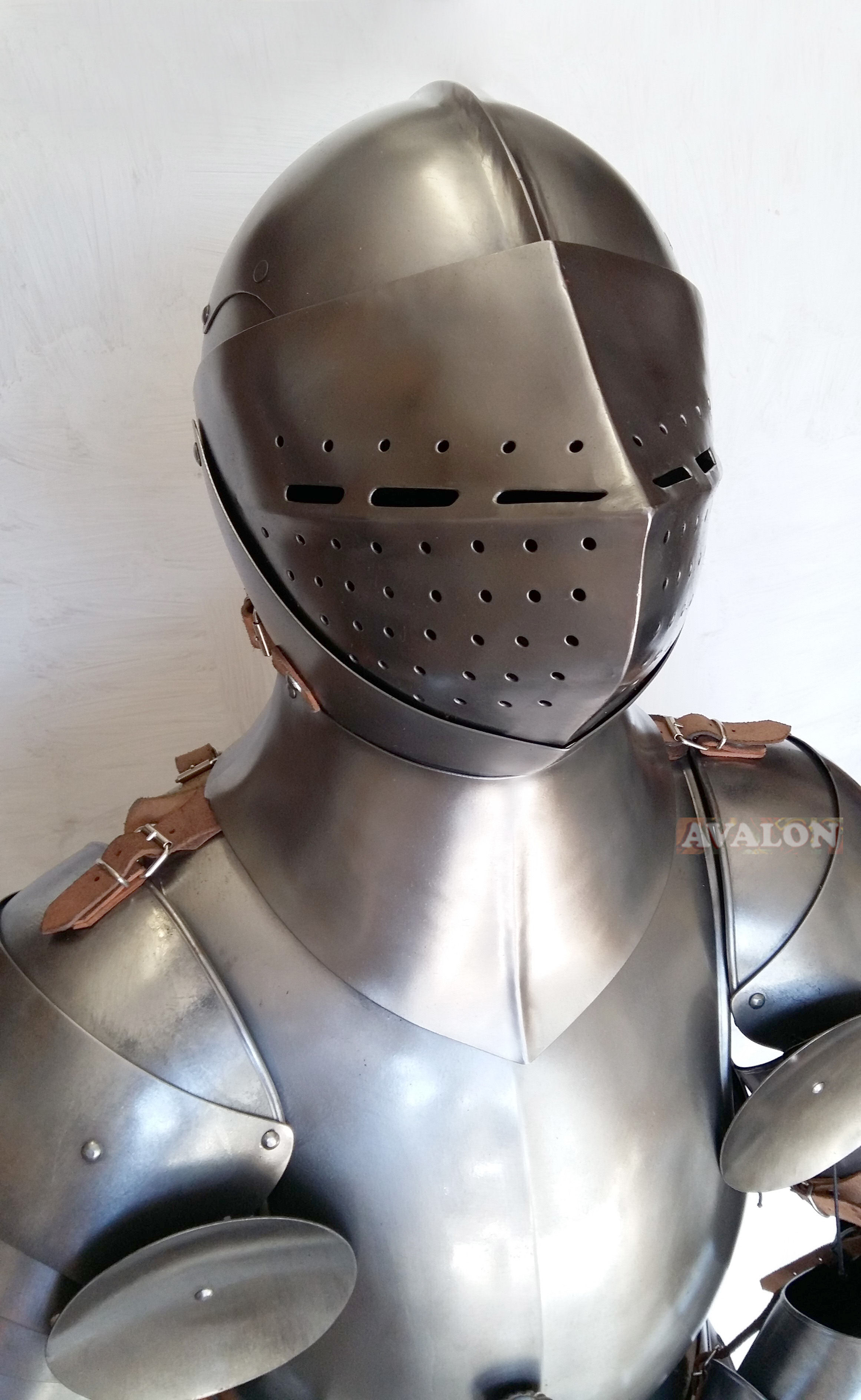 Armatura medievale periodo 1360, con Elmo Gran Bacinetto alla francese; armatura realizzata in acciaio lavorato a mano con base in legno. Armatura medievale ideale per rievocazione storica e per i tornei medievali.