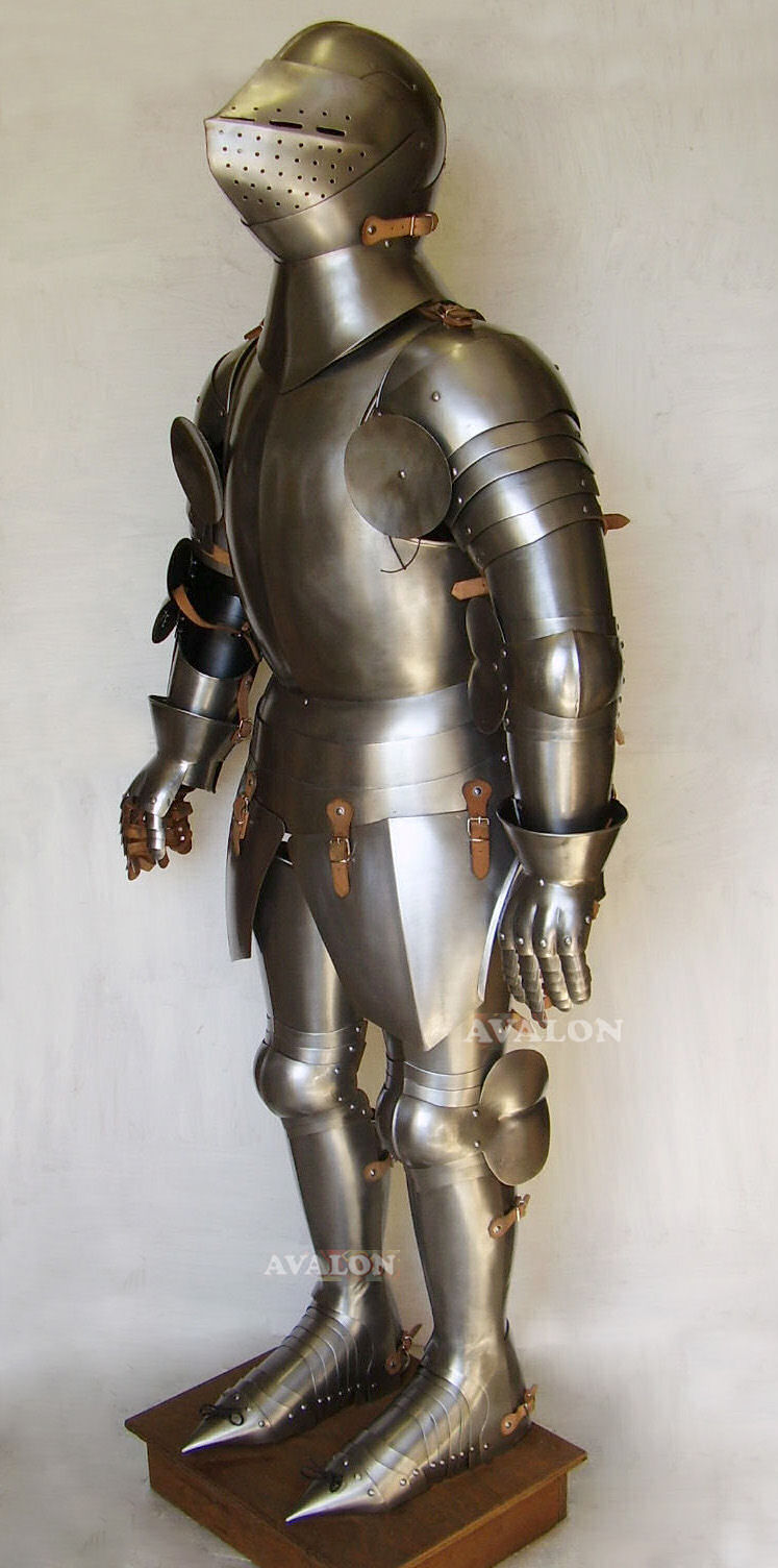 Armatura Medievale da Cavaliere composta dalle seguenti parti: 1- Elmo Gran Bacinetto alla francese. 2- Corazza parte dell'armatura medievale a protezione del torso e della schiena, costituita dal Pettorale e dalla schiena armatura. La corazza viene realizzata sulle vostre misure da indicare nell'ordine (circonferenza del torace a livello del seno, altezza totale e peso). 3- Spallacci a protezione delle spalle, questa parte dell'armatura copre le spalle, gli spallacci sono ancorate alla corazza tramite incastro e cinghie in cuoio. 4- Armatura a Protezione del Braccio, costituito da tre parti: il cannone superiore (protezione dell'avambraccio), la cubitiera (protezione del gomito) con ala laterale e cannone inferiore. Sono articolate tra di loro tramite piastre incernierate, arcuate e fissate da rivetti scorrevoli. 5- Manopole articolate, guanti d'arme, guanti di protezione medievali a protezione della mano e del polso. 6- Cosciali, Ginocchielli, Schinieri, elementi di armatura a protezione della gamba, articolati in modo da dare la massima mobilità al combattente. 7- Scarpe articolate a difesa del piede con l'estremità di diversi formati di vostra scelta, le scarpe sono realizzate in acciaio laminato a freddo. Questa eccezionale riproduzione di Armatura Medievale da Cavaliere è realizzata nella tradizione dei maestri artigiani Milanesi, che creavano gli originali per cavalieri da adoperare in combattimento o per parate. Questa Armatura Medievale da Cavaliere indossabile ed articolata ha una finitura in acciaio spazzolato, riproduzione del modello degli originali armature medievali che oggi si possono ammirare nelle collezioni museali di tutto il mondo.