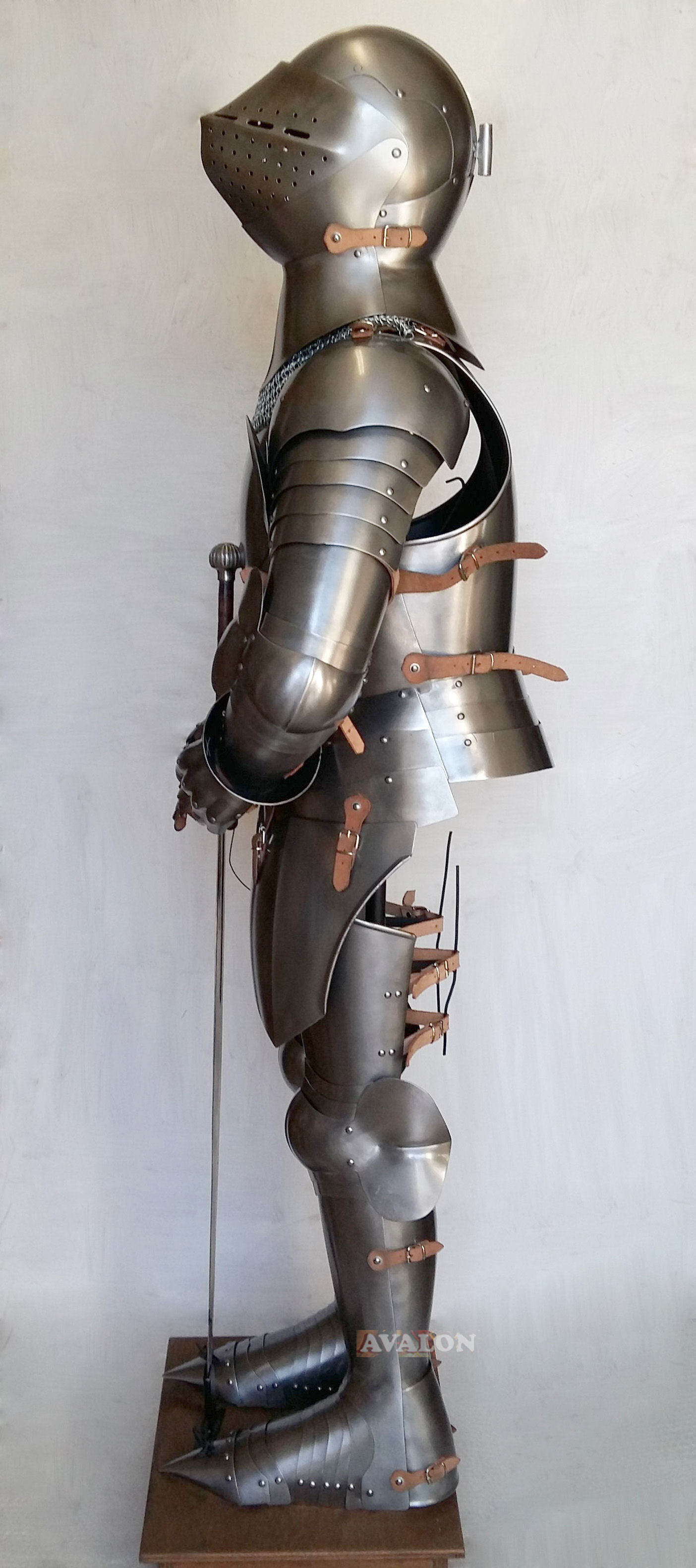 Tutte le armature medievali sono realizzati a mano in Italia; ogni armatura, oltre ad essere completamente indossabile, è possibile comporla in pochi minuti su una propria base di legno.