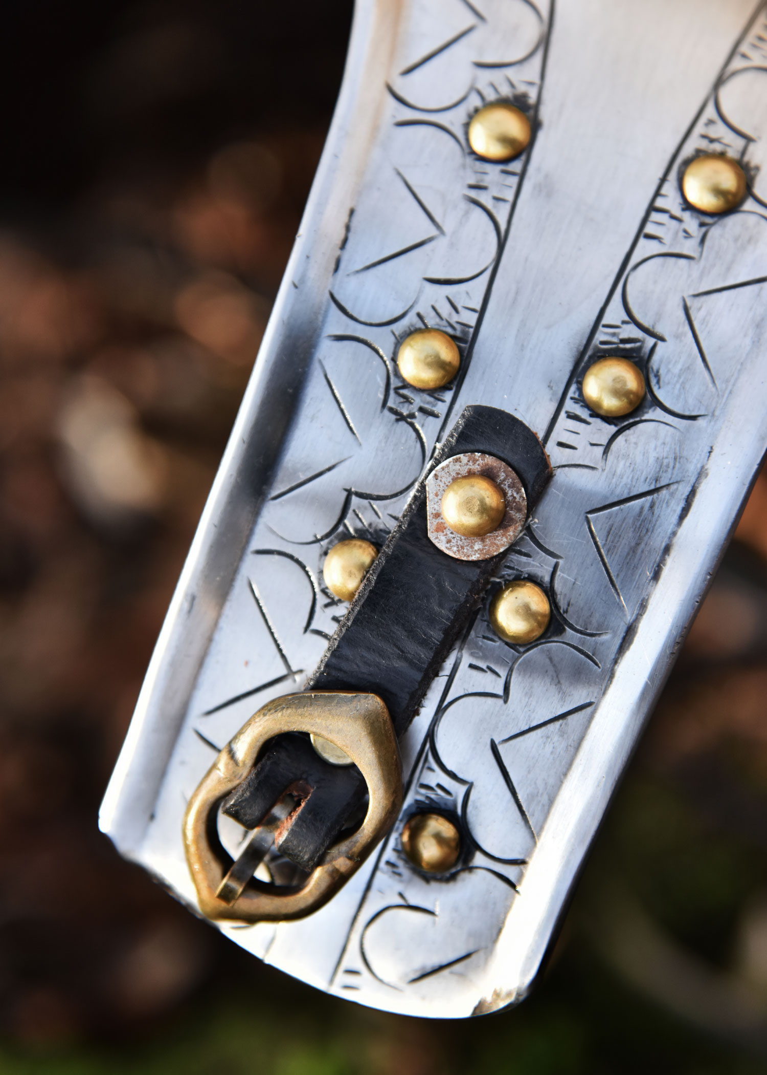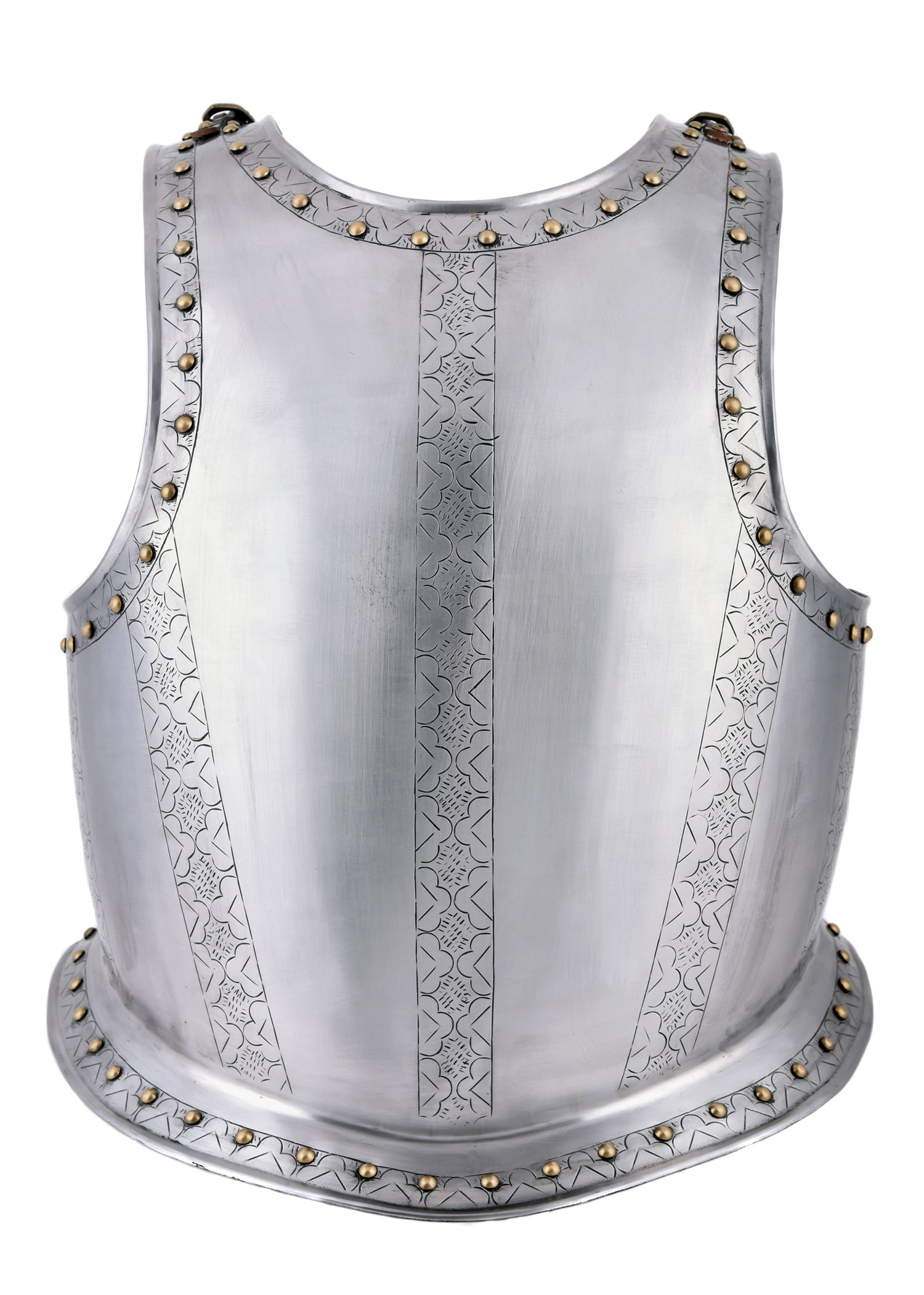 Pettorale medievale, imbracatura in acciaio con incisioni Replica indossabile di un'armatura medievale in lamiera d'acciaio. Include due cinturini incrociati nella parte posteriore, regolabili nelle dimensioni tramite fibbie. L'imbracatura è decorata con bellissime incisioni e presenta anche rivetti decorativi in ottone lungo i bordi. Gli scalfi ben dimensionati offrono spazio sufficiente per consentire alle braccia di muoversi liberamente. Particolari: