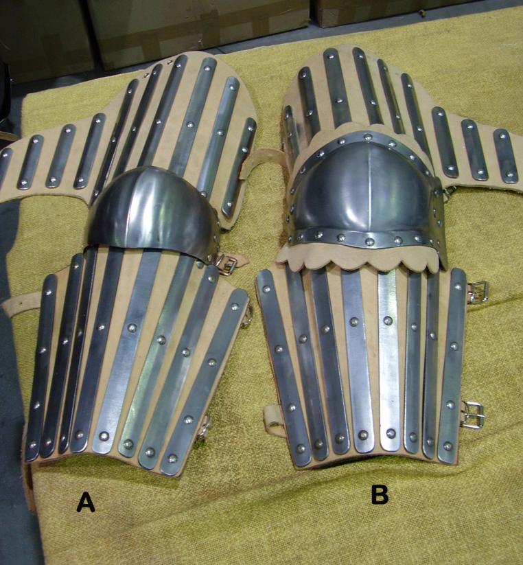 Protezione delle braccia, parte di armatura costituita da stecche in acciaio su cuoio. La parte a protezione del gomito è in acciaio con possibilità di sceltà fra due modelli A e B, ll prezzo è riferito alla coppia