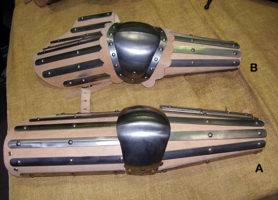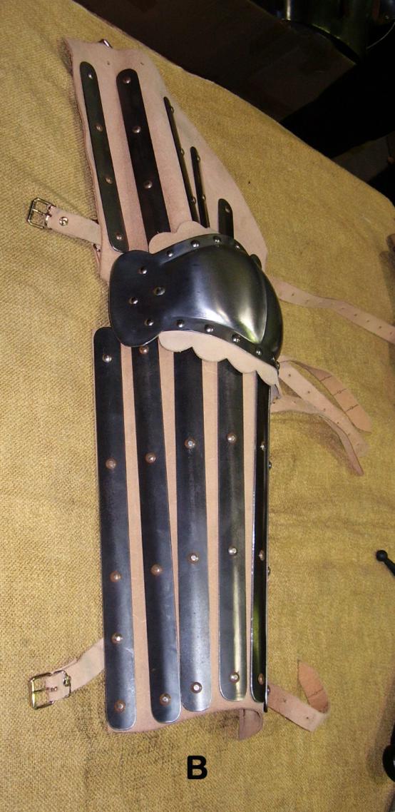 Protezione delle gambe, parte di armatura costituita da stecche in acciaio su cuoio. La parte a protezione del ginocchio è in acciaio con possibilità di sceltà fra due modelli A e B, ll prezzo è riferito alla coppia Equipaggiata con cinghie in cuoio per essere indossato. Realizzato interamente in acciaio e cuoio, lavorato a mano.