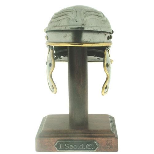 Riproduzione in miniatura di un elmo romano del tipo Imperiale Gallico in uso tra i legionari nel I secolo d.C. Interamente realizzato in metallo lavorato a mano con rifiniture ottonate e provvisto di piedistallo in legno. Altezza totale circa 20 cm.