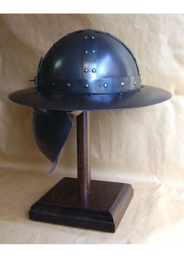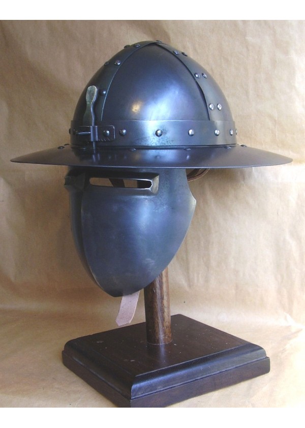 Cappello D'Arme con maschera facciale corazzata a protezione del viso nei combattimenti pesanti. Elmo diffuso tra le forze di fanteria tra il secolo X e XIV e dalle forze di cavalleria pesante.