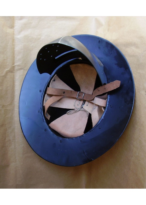 Cappello D'Arme coppo tondeggiante con maschera facciale corazzata protezione del capo in acciaio. Riproduzione indossabile di un elmo in uso dalla fanteria tra il secolo X e XIV. Cappello d'Arme a coppo tondeggiante con protezione del naso era molto utile nella guerra d'assedio, ha dato una buona protezione contro i colpi dall'alto come da spade di cavalleria. Questa riproduzione di Cappello d'Arme è indossabile, personalizzabile in dimensioni e spessore: (1,2 mm - 2 mm). Elmo è l'ideale per il combattimento, ma anche per spettacoli di rievocazione medievali. L'interno dell'elmo presenta una cuffia in cuoio regolabile per essere indossato, l'elmo ha una sottogola in cuoio e fibbia in ottone. Dettagli:
