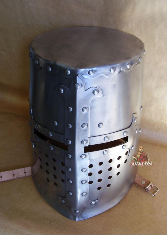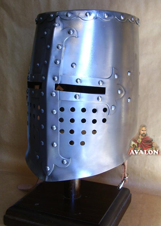 Elmo Crociato da combattimento apparso nella prima metà del secolo XI, utilizzato dai crociati durante il XII ° secolo, di solito in combinazione con un camaglio in ferro ad anelli. Elmo chiuso in acciaio sviluppato nel Basso Medioevo ed in dotazione alle forze di cavalleria pesante. Elmo molto massiccio, formato da un corpo cilindrico in lamiera di acciaio al quale sono praticate piccole feritoie per garantire la visibilità. Sul davanti vi è una croce, anticamente sulla sommità usava decorarlo con un elaborato cimiero, corna, ali di drago, ecc. Questo elmo è l'ideale per il combattimento, ma anche per spettacoli di rievocazione medievali. L'interno dell'elmo presenta una cuffia in cuoio regolabile per essere indossato, l'elmo ha una sottogola in cuoio e fibbia in ottone. Dettagli: