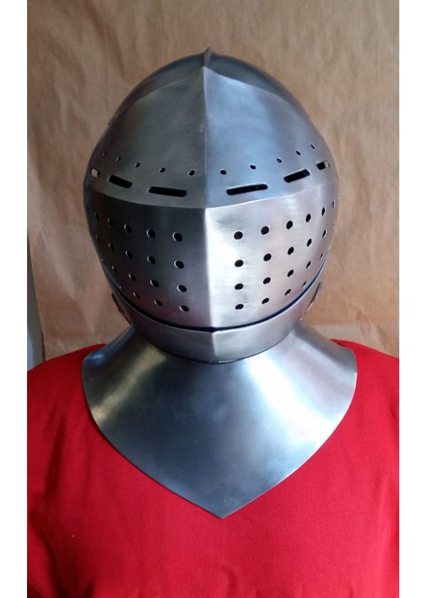 Il bacinetto era una tipologia di elmo di origini italiane in uso nell'Europa medievale(XIV secolo). Si distingue per la forma appuntita, leggermente inclinata all'indietro, del coppo. L'elmo è interamente realizzato a mano ed è indossabile e funzionale. La visiera è a becco e presenta molteplici fori d'aereazione, può essere sollevata e bloccata con un gancio per migliorare la respirazione e la vista. Questo stile di elmo medievale è ideale per il combattimento, buhurt e per parate di rievocazione storica medievale, ma anche per il LARP. Prodotto realizzato da artigiani italiani, dotato di cinturini in cuoio e fibbie per essere comodamente indossato. Insieme all'elmo viene fornita un'infula imbbottita per il massimo comfort. Sul retro dell'elmo è presente un portapennacchio o porta piume. L'elmo è personalizzabile in dimensioni, finitura e spessore(1mm - 1,2 mm - 1,5 mm - 2mm). Interamente realizzato in acciaio al carbonio e lavorato a mano da artigiani italiani.