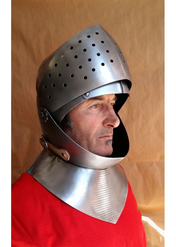 Elmo da Cavaliere a protezione della testa, sviluppatosi dal bacinetto a visiera eliminando il camaglio, allungando il coppo e fornendo il copricapo di una barbozza fissa o girevole sulle bande, presenta una fantastica gorgiera.