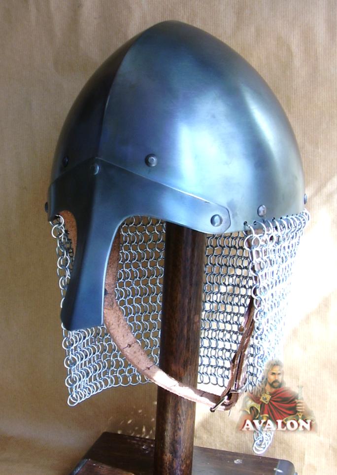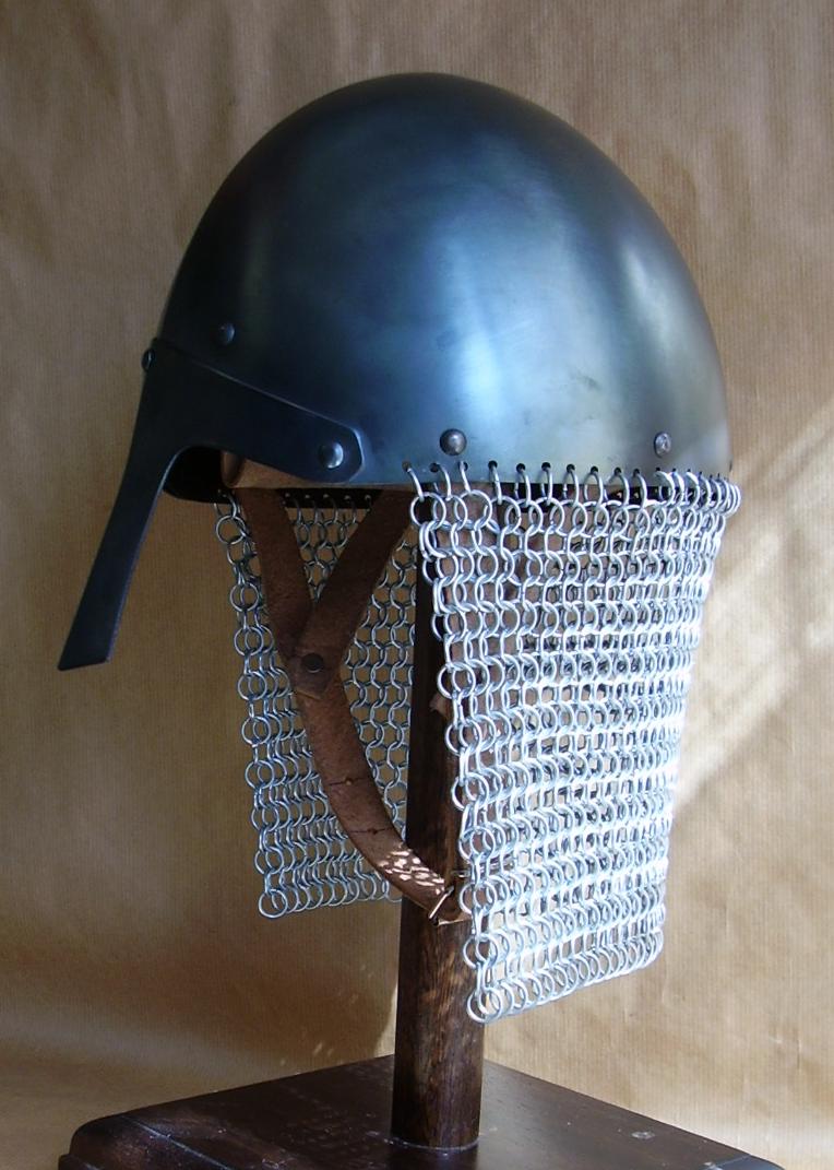 Elmo Nasale di tipo Normanno con maglia ad anelli di ferro a protezione del collo, elmo da combattimento caratterizzato dal possesso di una barra sporgente che proteggere il naso e il centro del viso