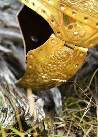 Elmo da auriga, realizzato nello stile di un elmo di tipo Illirico che lascia scoperto il viso. Interamente realizzato in metallo ...