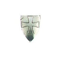 Spilla in peltro raffigurante uno scudo con disegnata una croce, insegna tipica degli ordini monastico cavallereschi di Templari, Ospitalieri e Teutonici.