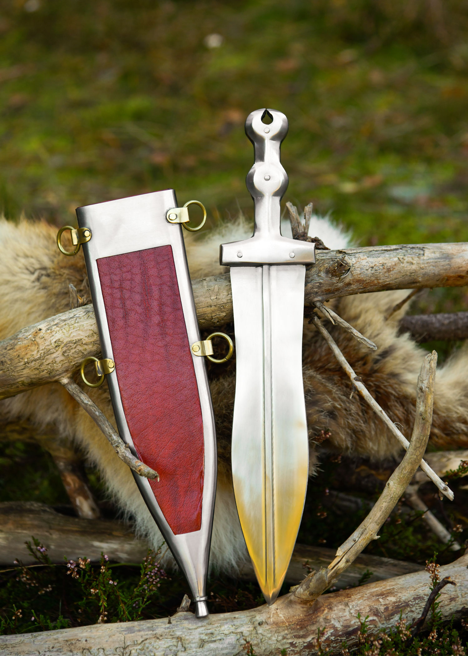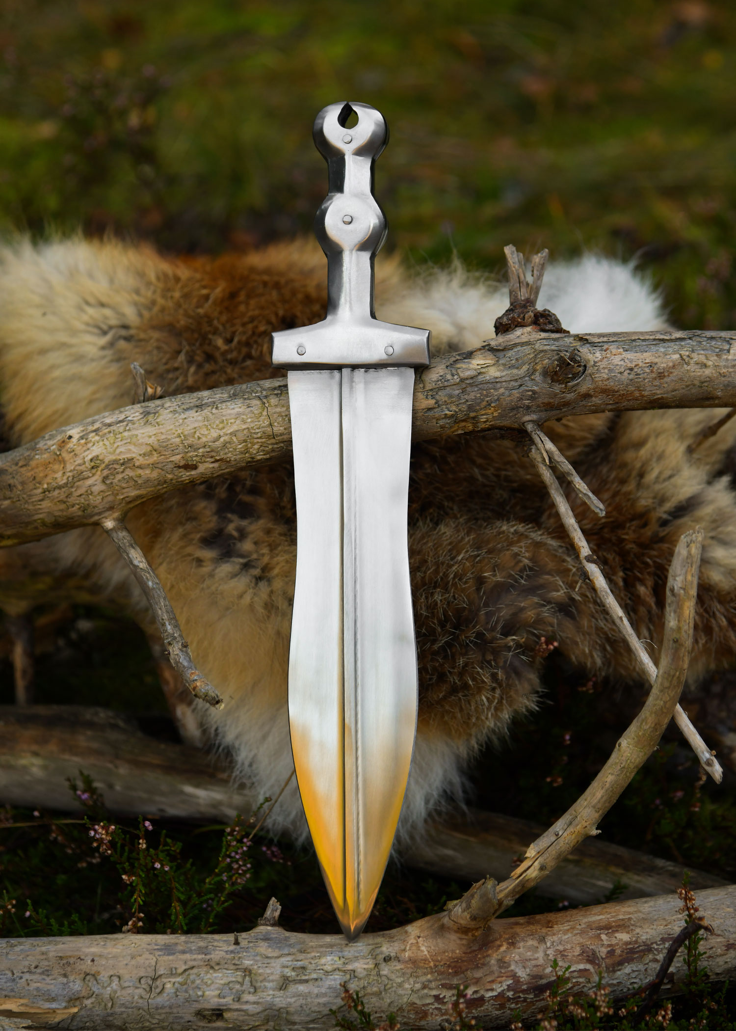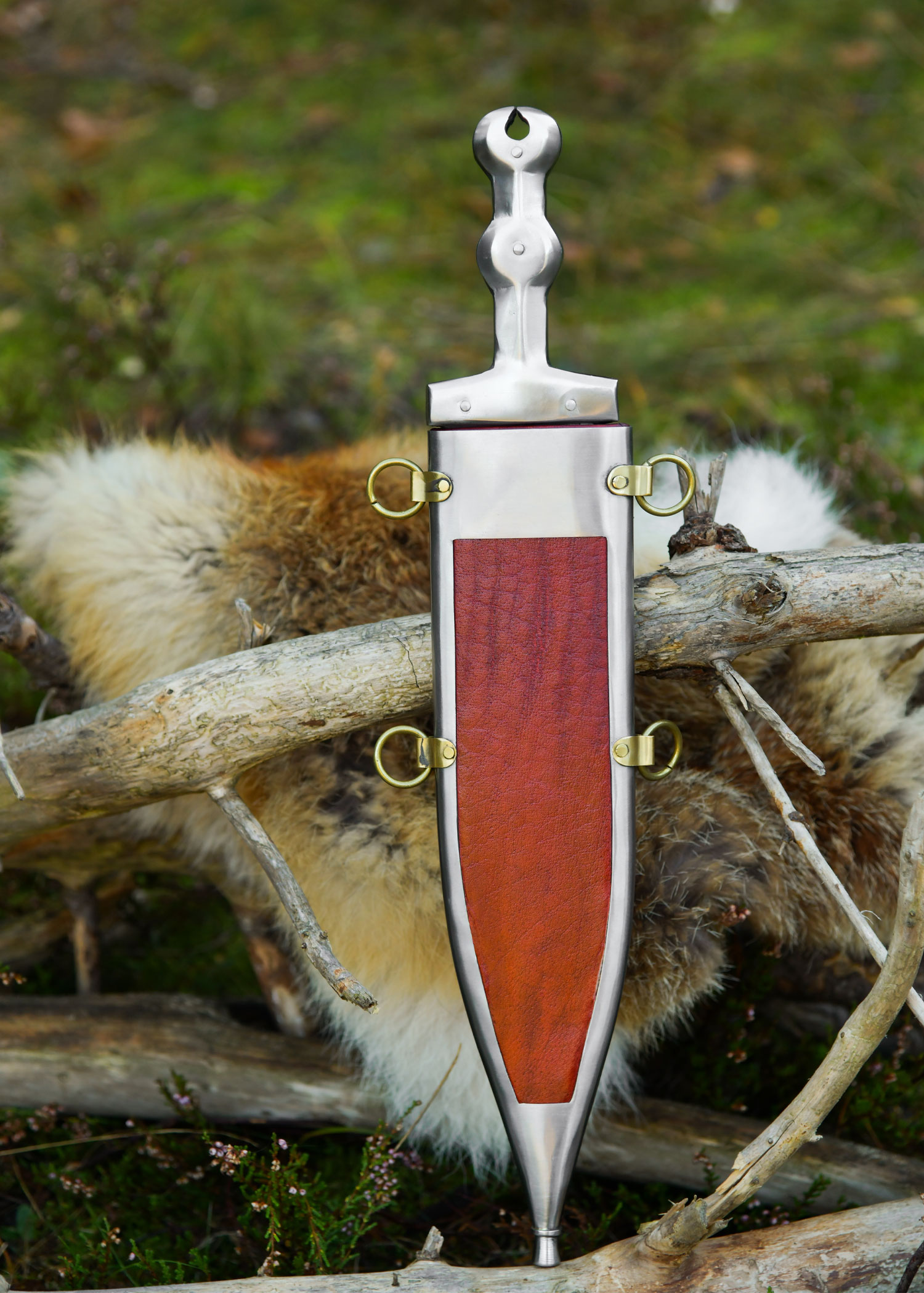 Pugio Romano, riproduzione di un pugnale romano del terzo secolo a.C. ritrovato nel forte romano vicino Künzing, veniva portato appeso sul lato sinistro dai legionari, mentre nei centurioni pendeva sulla destra. Lunghezza totale 38 cm.