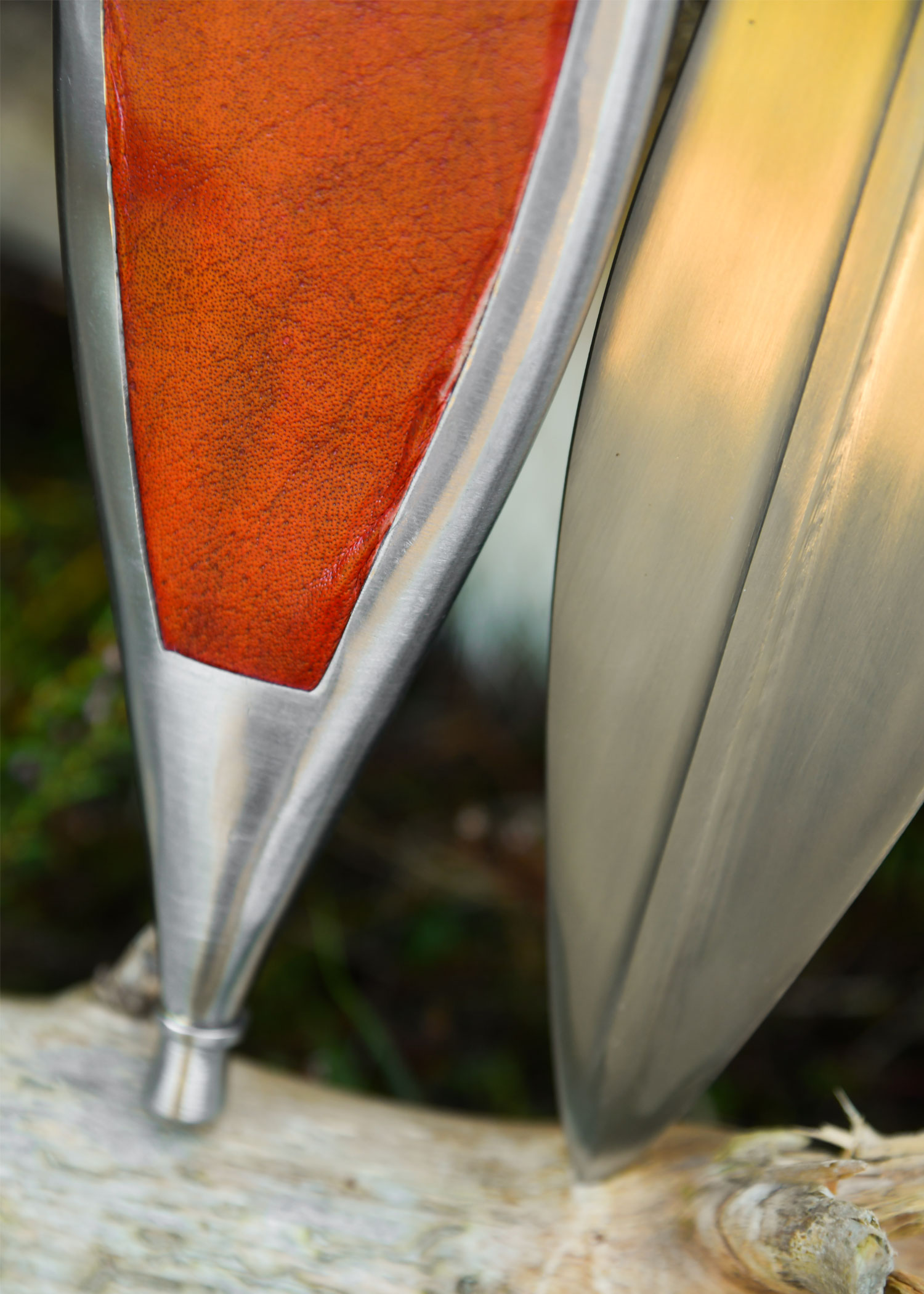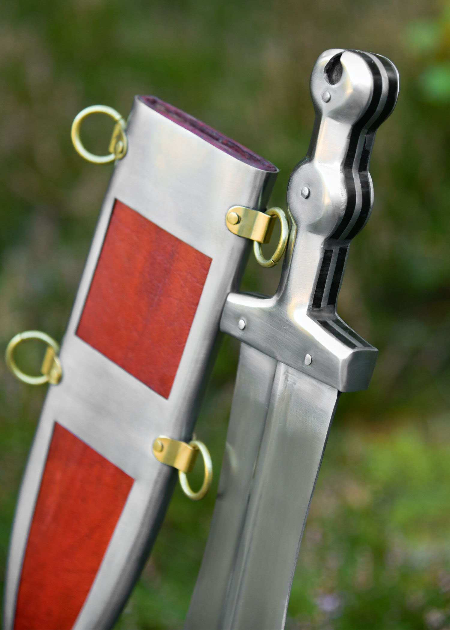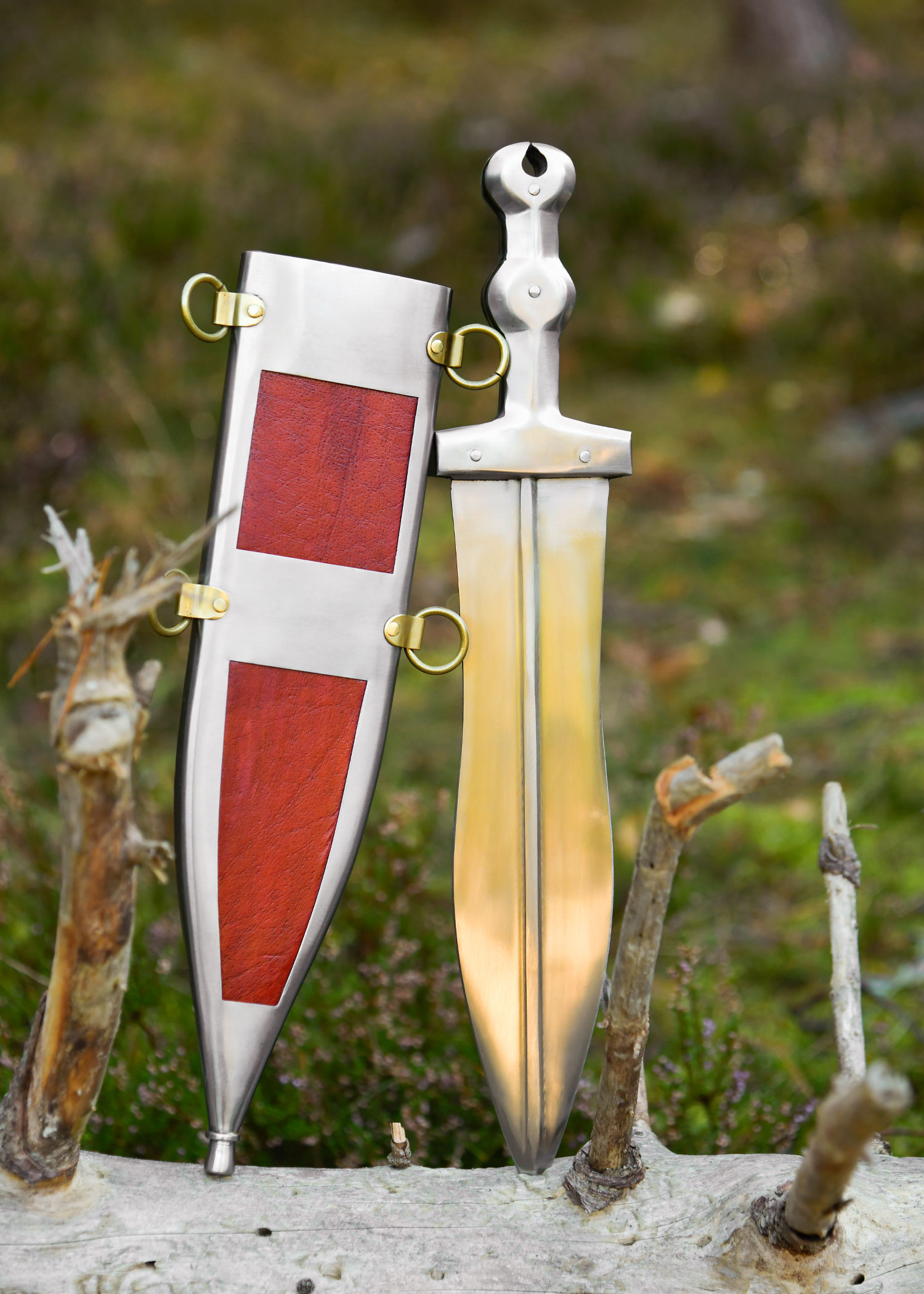 Pugnale romano. Versione in dotazione ai militari romani verso la seconda metà del II secolo d.C. In seguito il Pugio sembra scomparire dall'equipaggiamento del miles: infatti sui bassorilievi della colonna Traiana sembra non essercene più traccia. Veniva portato appeso sul lato sinistro dai legionari, mentre nei centurioni pendeva sulla destra. Lama larga in acciaio a doppio taglio così come l'impugnatura. Provvisto di fodero in metallo ornato con inserti in pelle rossa e dotato di anelli di sospensione. Lunghezza totale 36 cm. Riproduzione di un Pugio Romano ritrovato nel forte romano vicino Künzing (Baviera) risalente al III ° secolo d.C. Dettagli Nota: