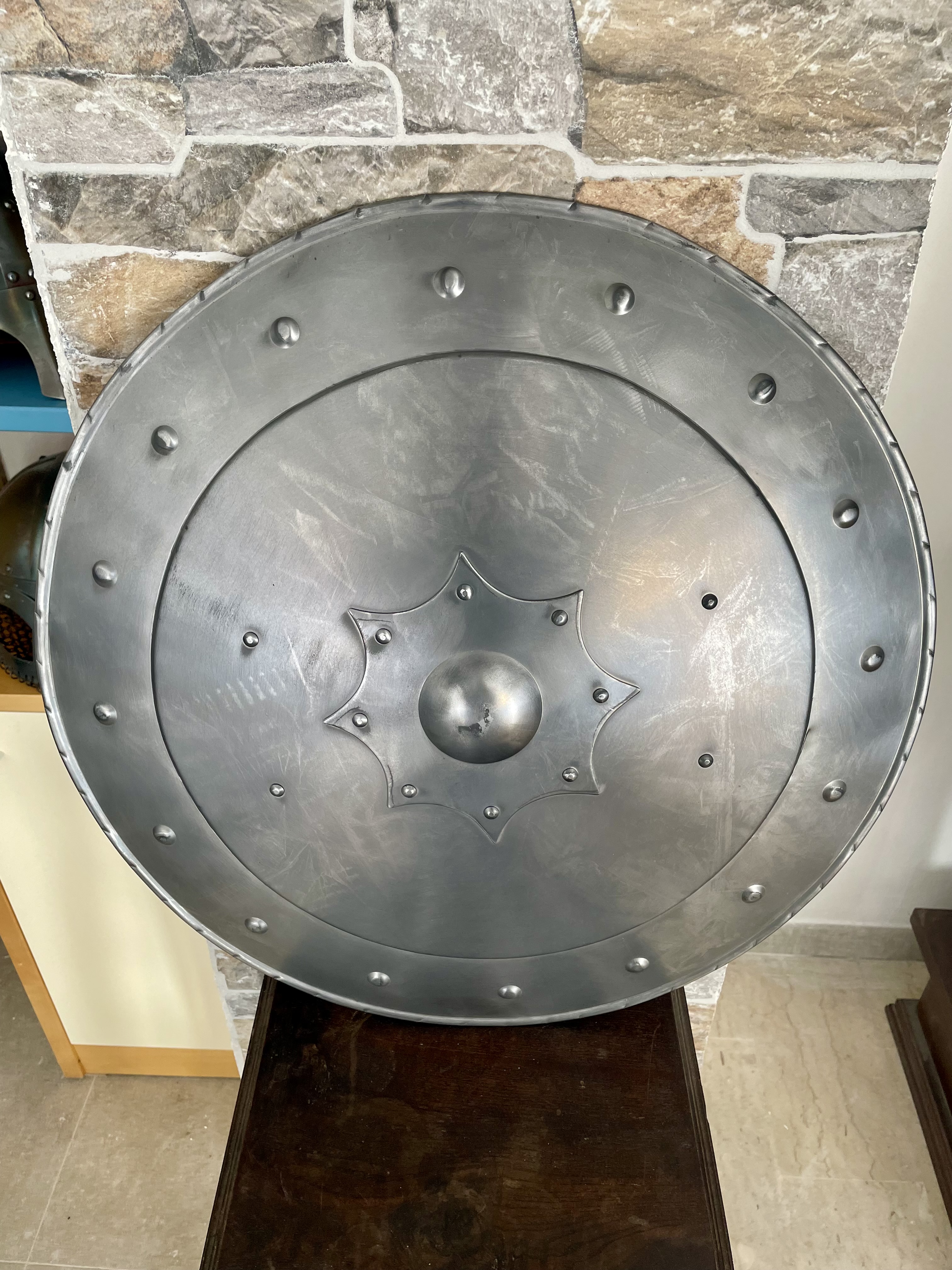 Scudo medievale in ferro – Italia settentrionale, XIV secolo Scudo medievale portatile da imbracciare, di forma circolare e profilo convesso, utilizzato tra il XIV e il XVI secolo. Questo modello, riconducibile all’Italia settentrionale del XIV secolo, è caratterizzato da un pronunciato umbone centrale, elemento tipico degli scudi di questo periodo. Realizzato interamente in ferro lavorato a mano, lo scudo era generalmente associato alle armature da parata e agli equipaggiamenti cerimoniali. Gli scudi destinati all’uso bellico risultavano meno comuni, poiché in combattimento veniva spesso preferito il brocchiere, più leggero e maneggevole. Grazie alla sua struttura robusta e al profilo convesso, questo scudo medievale rappresenta un eccellente esempio di manifattura storica, ideale per rievocazioni medievali, collezionismo e allestimenti espositivi. Caratteristiche tecniche: Materiale: acciaio al carbonio Spessore acciaio: 1mm Tipologia: scudo rotondo da imbraccio Epoca: XIV secolo Diametro: 55 cm Peso: 2.100 g Sul retro sono presenti cinturini regolabili, che consentono una presa sicura e confortevole durante l’utilizzo.
