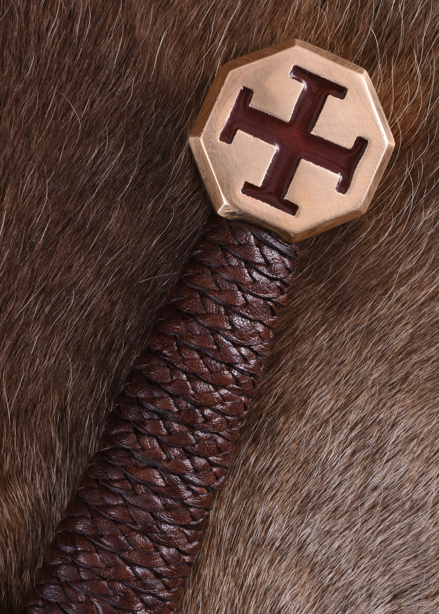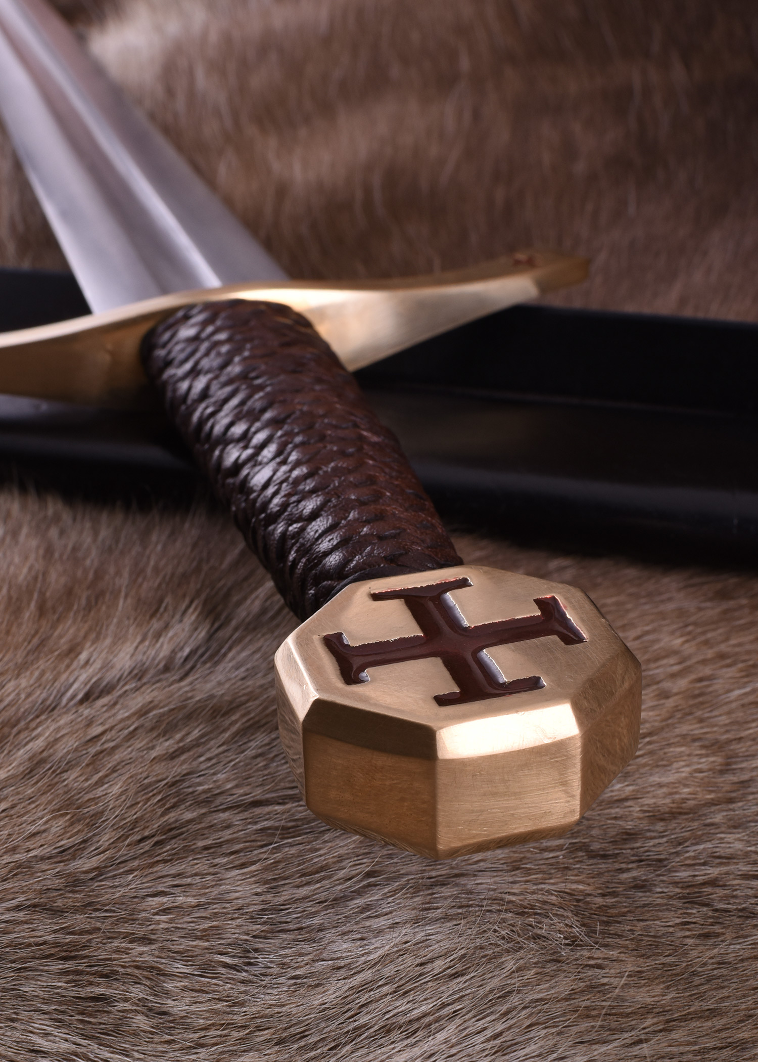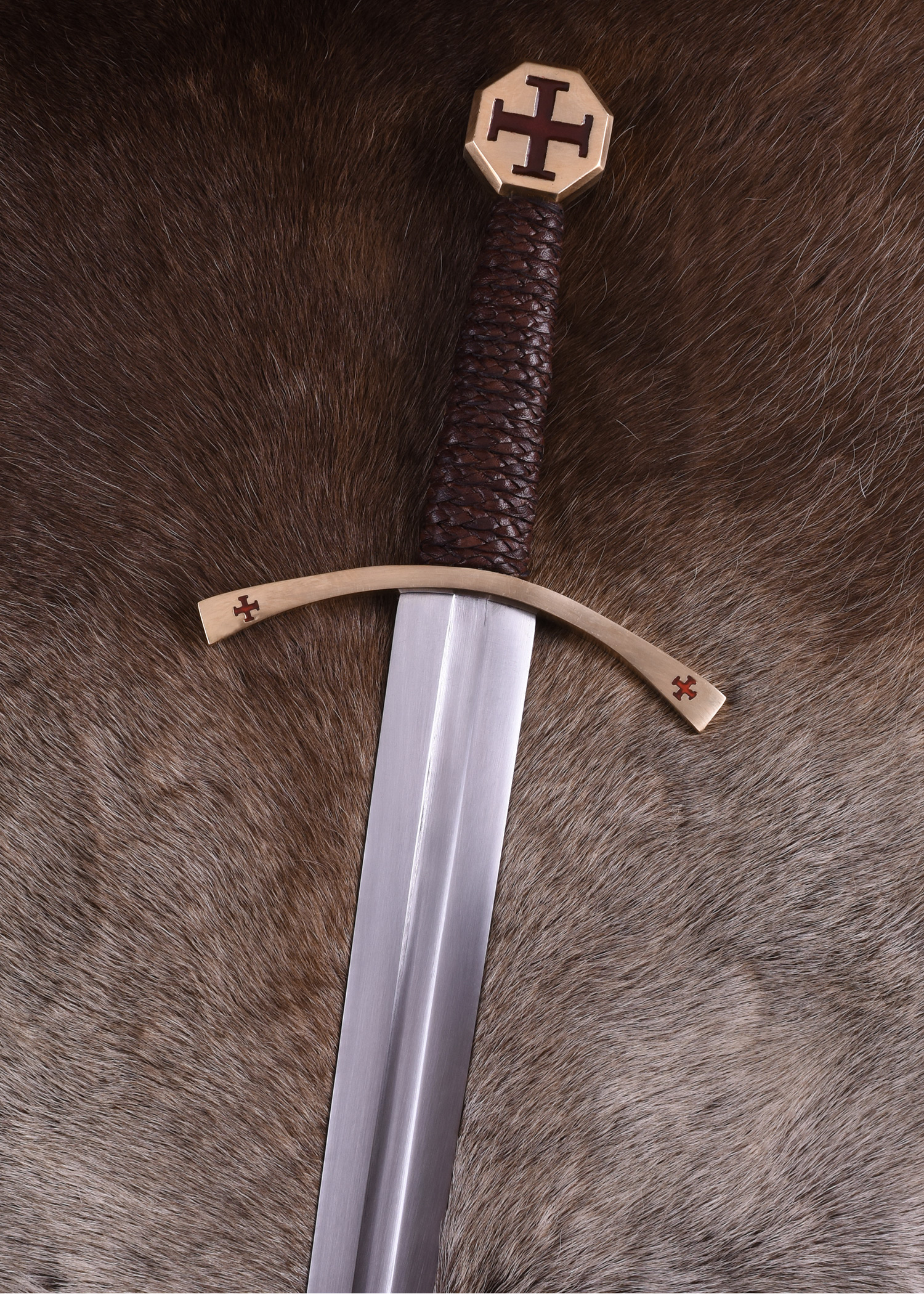 Spada templare. Lama in acciaio a doppio filo, in cui taglienti si restringono verso la punta che risulta essere molto acuminata, efficace nei colpi di stocco. L'elsa in metallo ottonato ha bracci curvi con croce alle estremità ancorata ritagliata su entrambe le facce, mentre l'impugnatura tronco-conica è rivestita in pelle marone. Infine, il pomello, sempre in metallo ottonato è di forma ottagonale con croce ancorata ritagliata su entrambe le facce. Completo di fodero rivestito di pelle. Lunghezza totale 98 cm Lunghezza spada: 95 cm lunghezza fodero: 79 cm Lunghezza lama: 75 cm Lunghezza impugnatura: 13 cm L. elsa: 18 cm lungheza pomo:5 cm larghezza lama alla base: 4,7 cm Peso: 1,4 kg. Disponibilità immediata, consegna in 2 giorni, se urgente anche in 24 ore. Oggetto di libera vendita e detenzione - vendita riservata ai clienti maggiorenni.