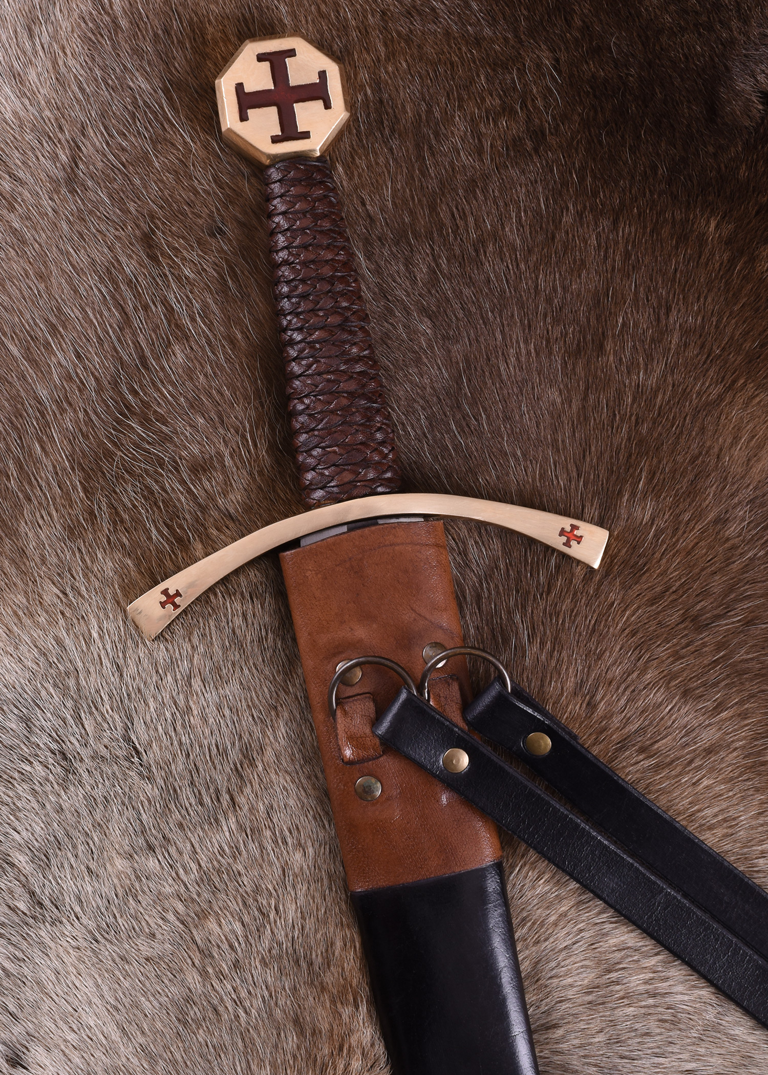 Spada templare con fodero e cinghie, lama in acciaio a doppio filo, in cui taglienti si restringono verso la punta, efficace nei colpi di stocco.Lunghezza 98 cm.