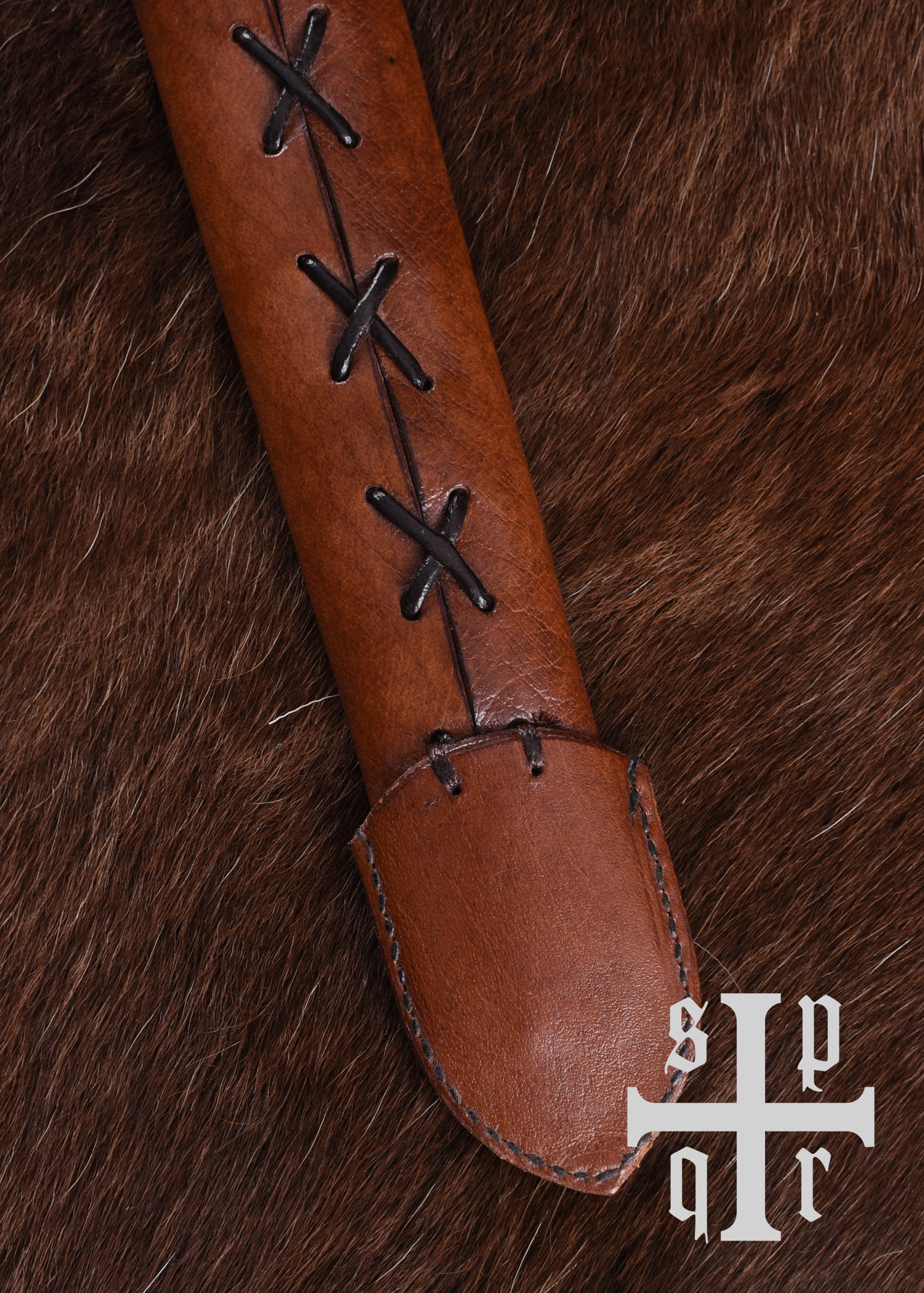 Questo bellissimo fodero per spada è realizzato a mano in pelle conciata al vegetale , di circa 3 mm di spessore e decorato con punti croce sul retro.