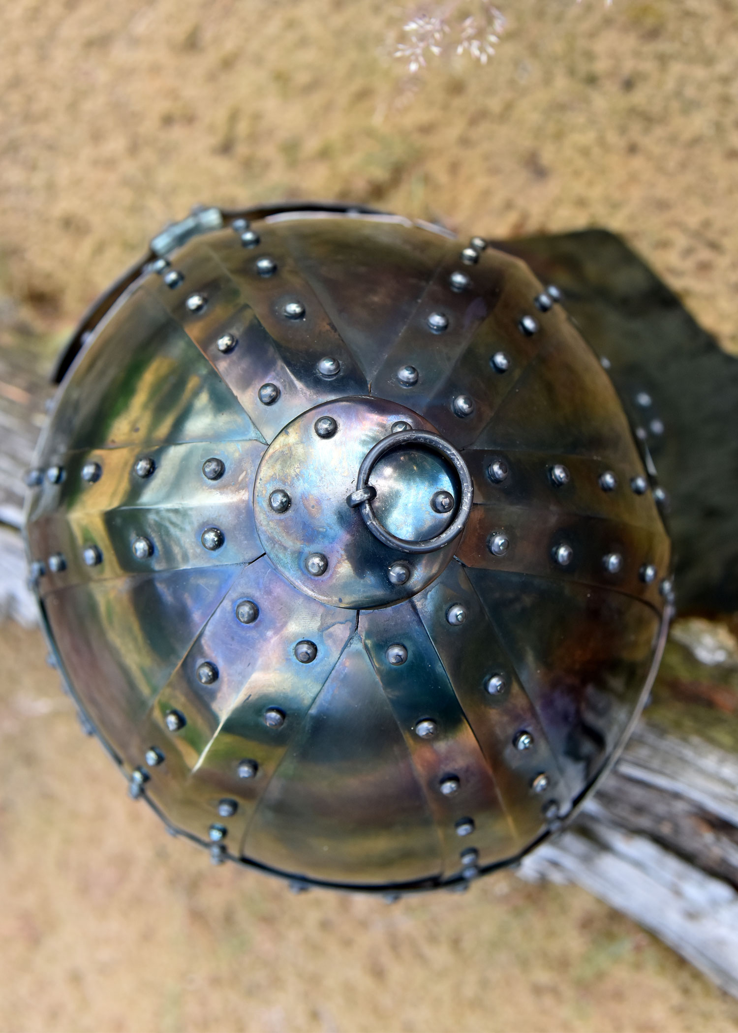 Spangenhelm tardo romano di Deir el-Medina, acciaio 1,6 mm - Pronto per la battaglia- Una replica molto autentica di uno spangenhelm tardo romano che è stato trovato a Deir el-Medina, un antico insediamento operaio di Tebe. L'elmo è stato datato alla prima metà del IV secolo d.C. ed è ora esposto al Museo Copto del Cairo. Presumibilmente Spangenhelms apparve per la prima volta nella cavalleria sarmata, una tribù di cavalieri dell'Iraq settentrionale, e guadagnò rapidamente grande popolarità tra romani, celti e tribù germaniche durante la tarda antichità, il periodo di migrazione fino al Medioevo. Disponibile in due taglie: Medium e Large. dettagli : Misure :
