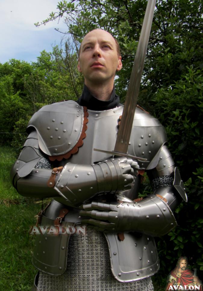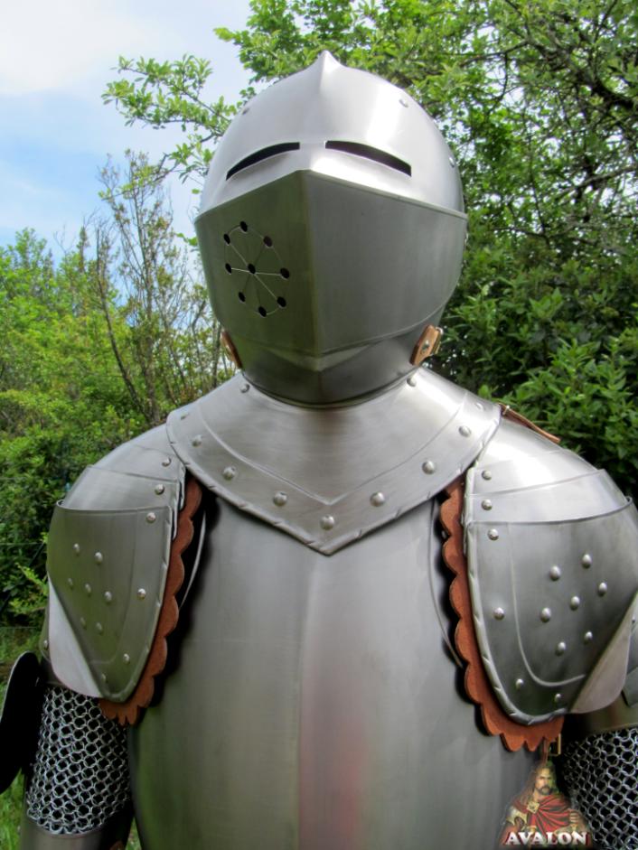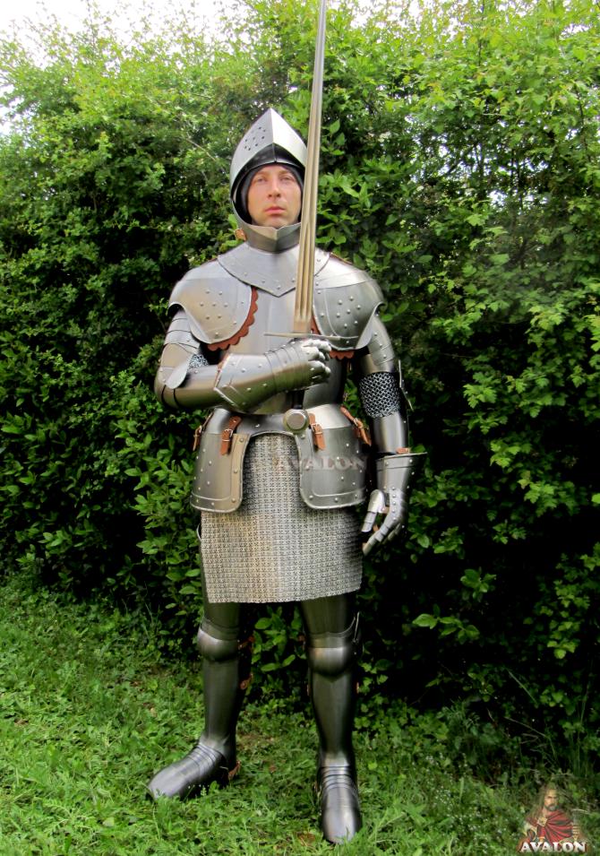 Armatura medievale indossabile (lucida) realizzata in acciaio lavorato a mano con base in legno e spadone in acciaio.