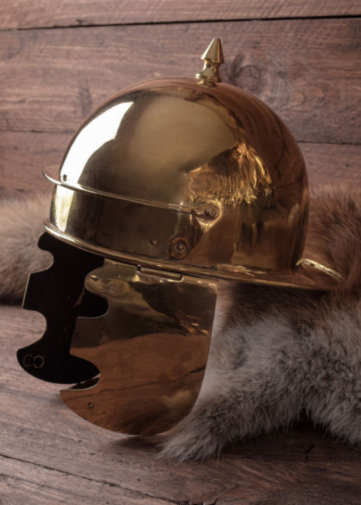 Ricostruzione di prima classe di un tipico elmo Coolus rinvenuto nell'ex accampamento romano nei pressi di Haltern am See (Germania). C'era uno dei più importanti complessi militari romani in Germania sulla riva destra del Reno 2000 anni fa. Fu sede di una delle legioni più famose: la 19a legione, che fu completamente distrutta nella battaglia di Varus nel 9 d.C.