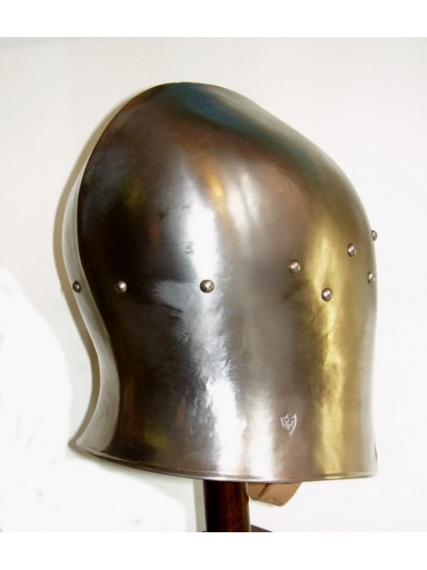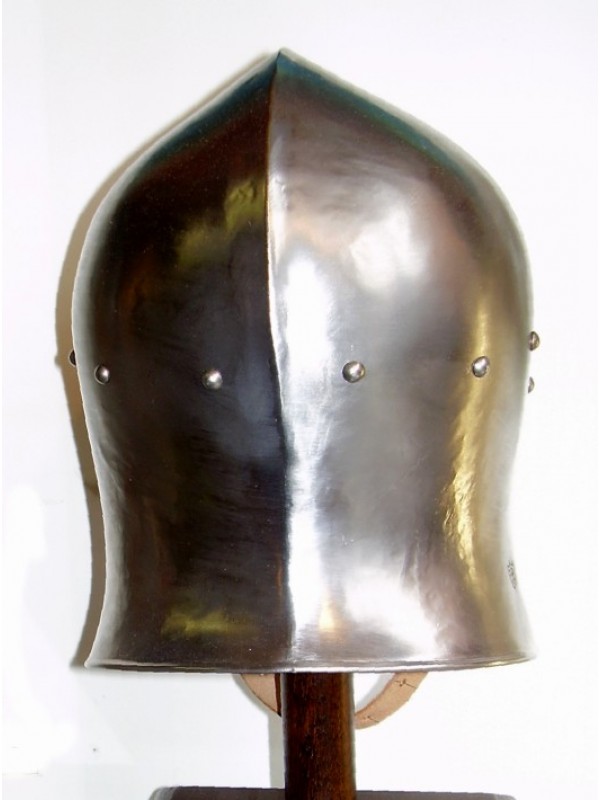 Elmo Barbuta, aderente alla testa e segnata da una costola mediana tra la linea frontale e la nuca; derivato dall'elmo bacinetto, utilizzato con una gorgiera ma senza il cappuccio di cotta di maglia.\r\n