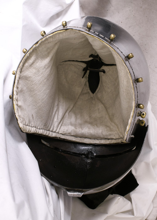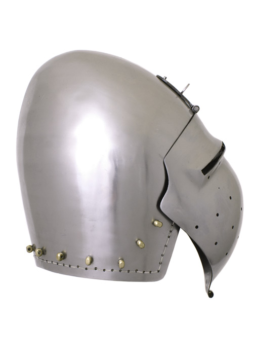 Elmo Bacinetto con visiera (Klappvisor) di origine germanica. Elmo medievale da combattimento battle-ready, caratterizzato da una forma appuntita del coppo e la leggera inclinazione all'indietro.