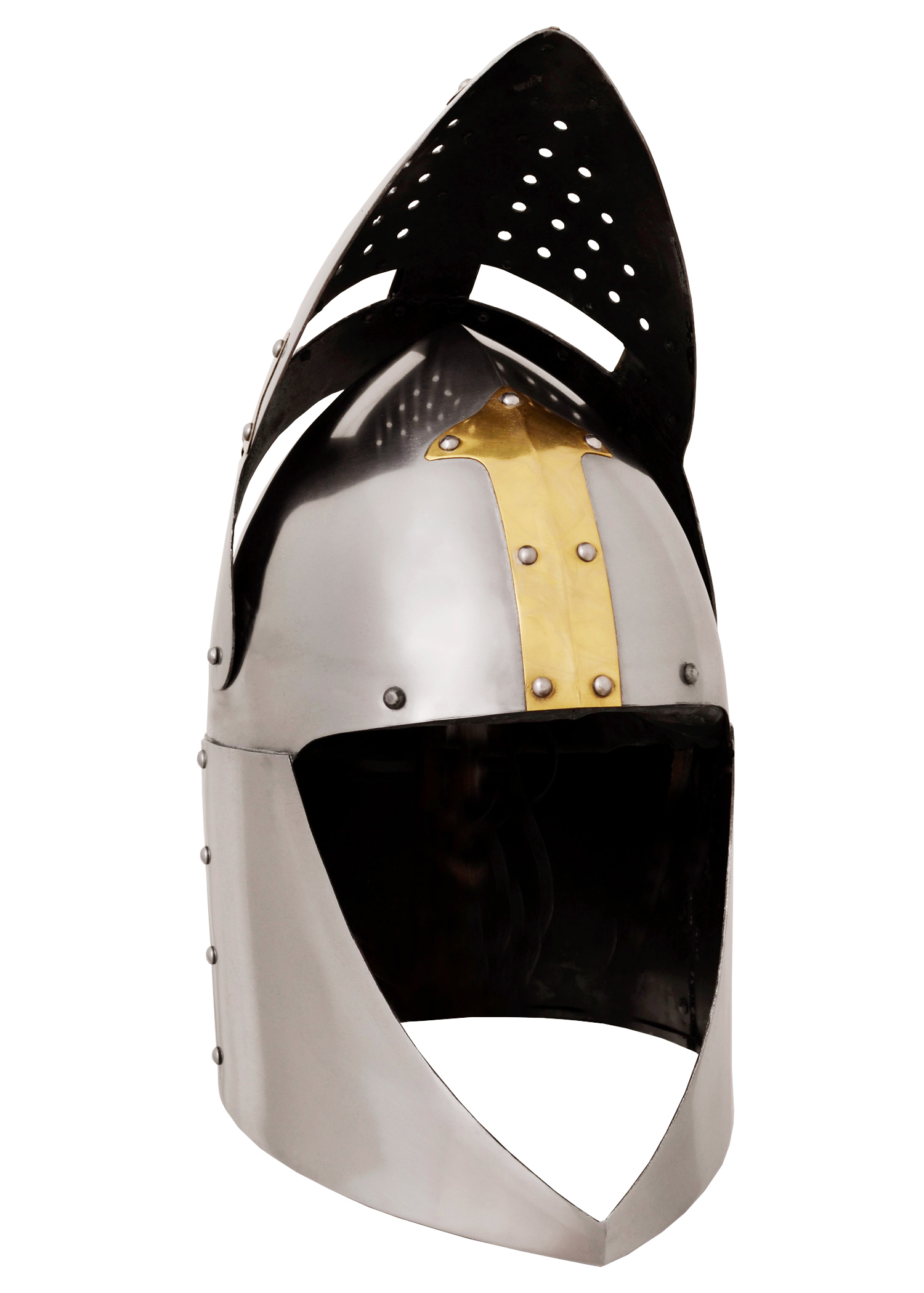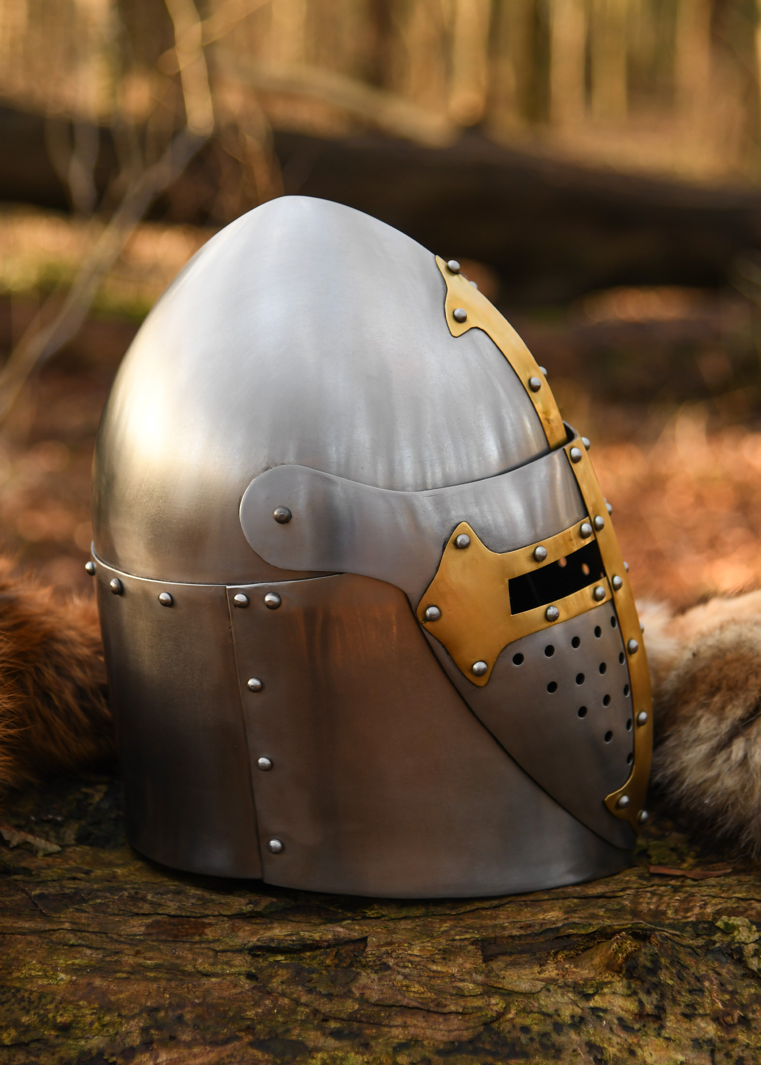 Grande elmo templare con croce in ottone e con visiera pieghevole, in acciaio da 1,6 mm, lucidato