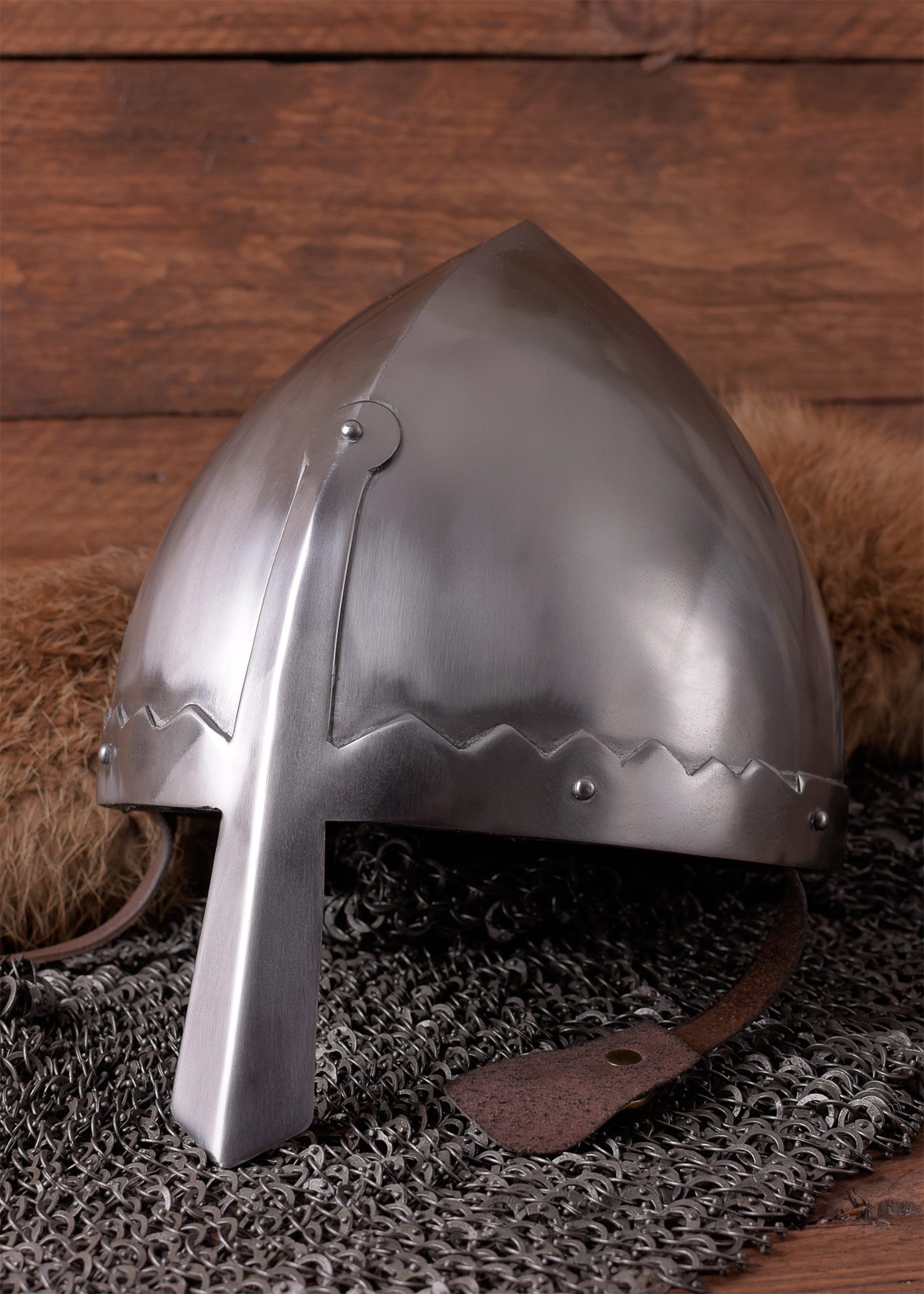 Elmo nasale normanno in acciaio da 1,6 mm.Ricostruzione di un tipico elmo normanno con punta rivettata, circa XI secolo. L'elmo è realizzato in acciaio al carbonio in spessore di circa 1,6 mm ed è quindi adatto alla rievocazione storica e combattimenti LARP.Include una comoda fodera in pelle e un cinturino per il mento.