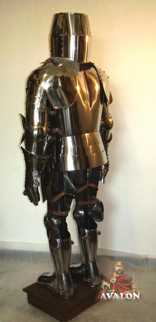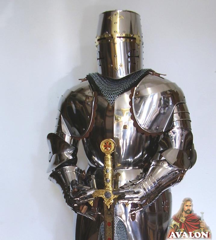 Armatura Template riprende la simbologia dei cavalieri Templari da modelli del quindicesimo secolo, dall'elmo con croce patente. Armatura Templare realizzata in acciaio, sostegno e base in legno, ideale per la rievocazione storica.