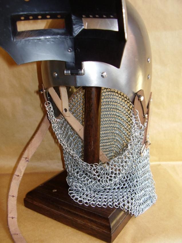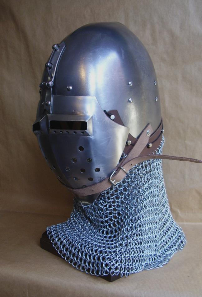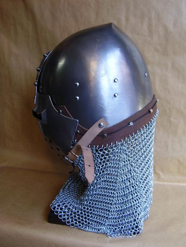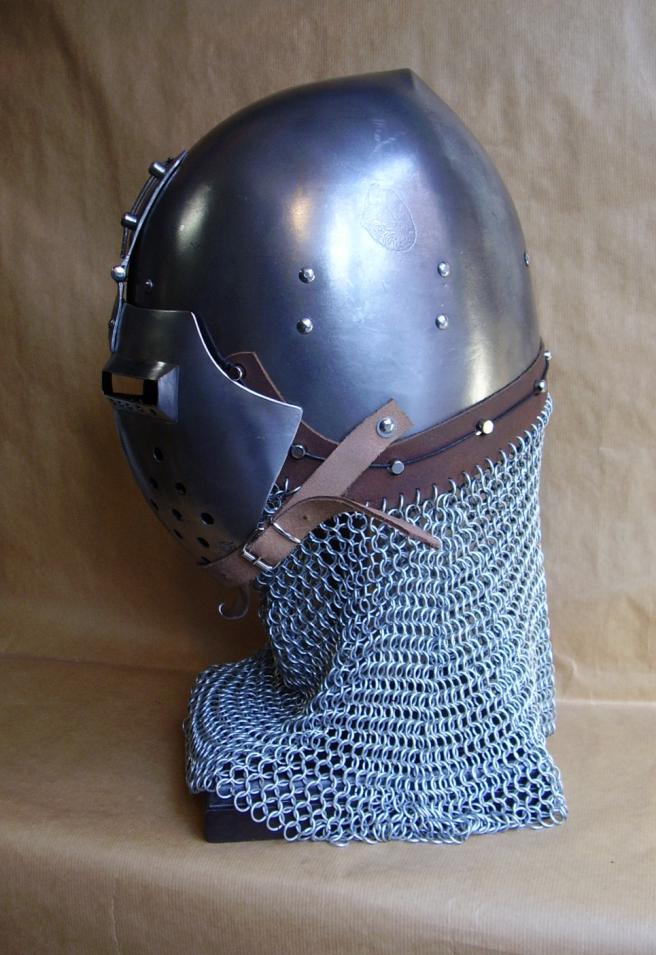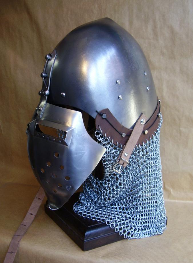 Elmo Bacinetto con visiera corazzata rimovibile (Klappvisor) di origine germanica. Elmo medievale da combattimento battle-ready, caratterizzato da una forma appuntita del coppo e la leggera inclinazione all'indietro.