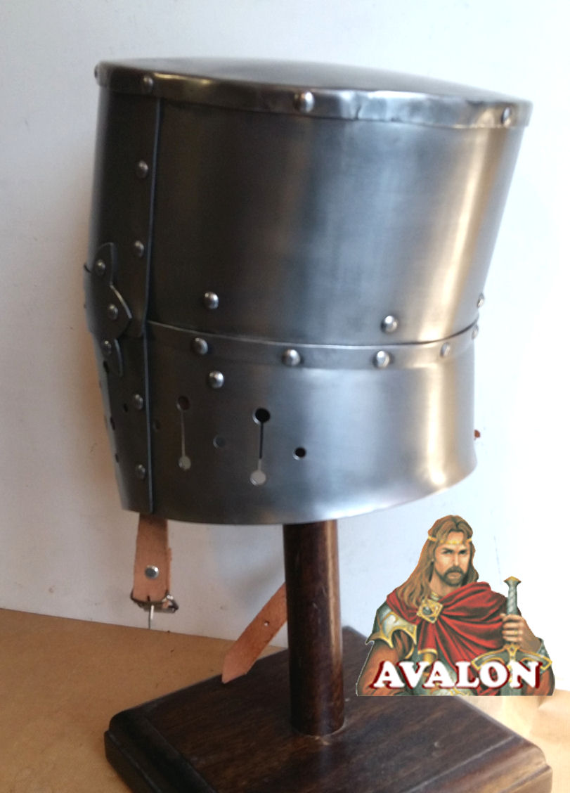Grande elmo chiamato anche Elmo Templare, Elmo Battle Ready a protezione della testa dei cavalieri durante le crociate nel XII° secolo. Questi elmi venivano indossati sia negli scontri campali che durante i tornei.
