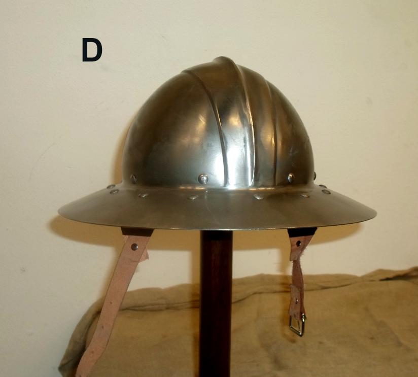 Cappello d'Arme in uso tra il secolo X e XIV destinato alle forze di fanteria, veniva indossato solitamente sopra un camaglio o una cuffia in stoffa imbottita e affiancato ad una barbozza. Interamente realizzato in acciaio lavorato a mano e indossabile. Cappello d'Arme a coppo tondeggiante con protezione del naso era molto utile nella guerra d'assedio, ha dato una buona protezione contro i colpi dall'alto come da spade di cavalleria. Questa riproduzione di Cappello d'Arme è indossabile, personalizzabile in dimensioni e spessore: (1 mm - 2 mm). Elmo è l'ideale per il combattimento, ma anche per spettacoli di rievocazione medievali. L'interno dell'elmo presenta una cuffia in cuoio regolabile per essere indossato, l'elmo ha una sottogola in cuoio e fibbia in ottone. Dettagli: