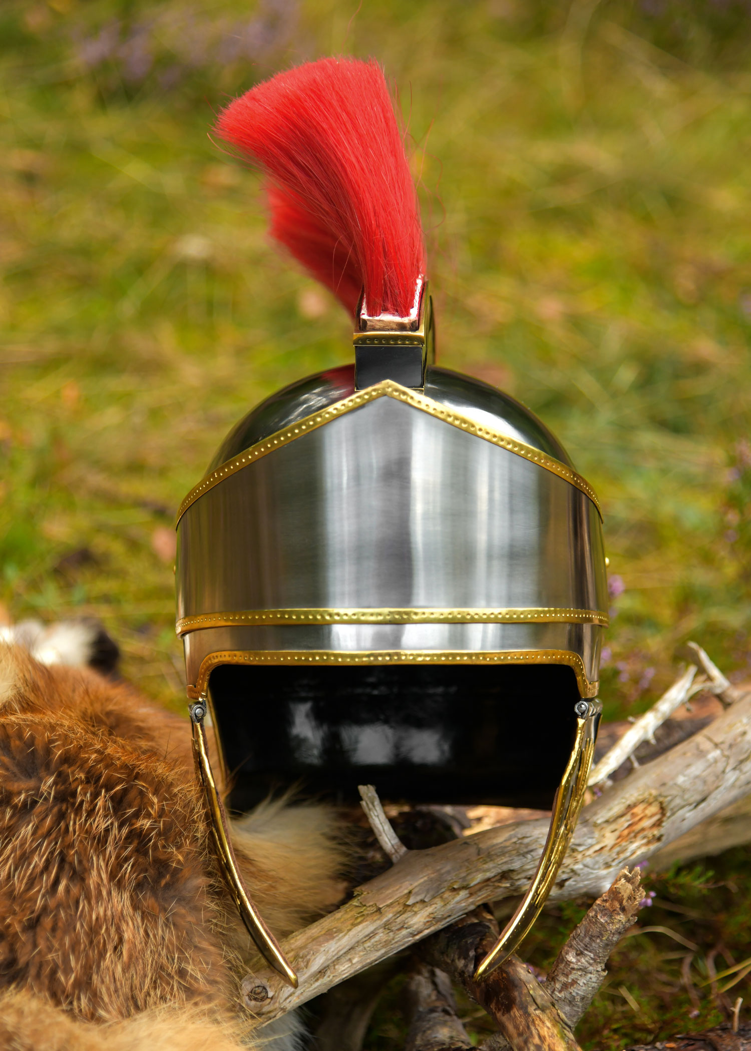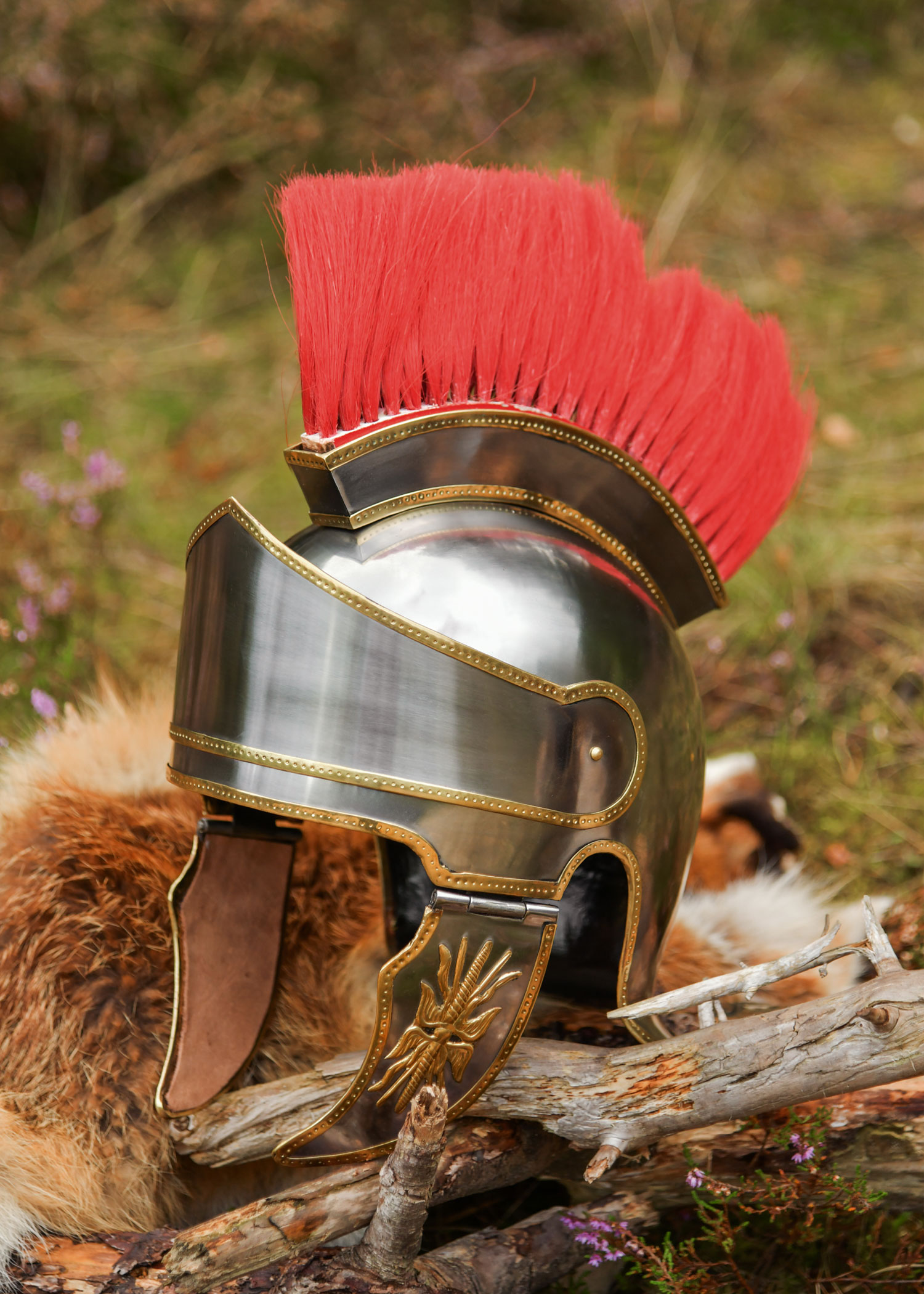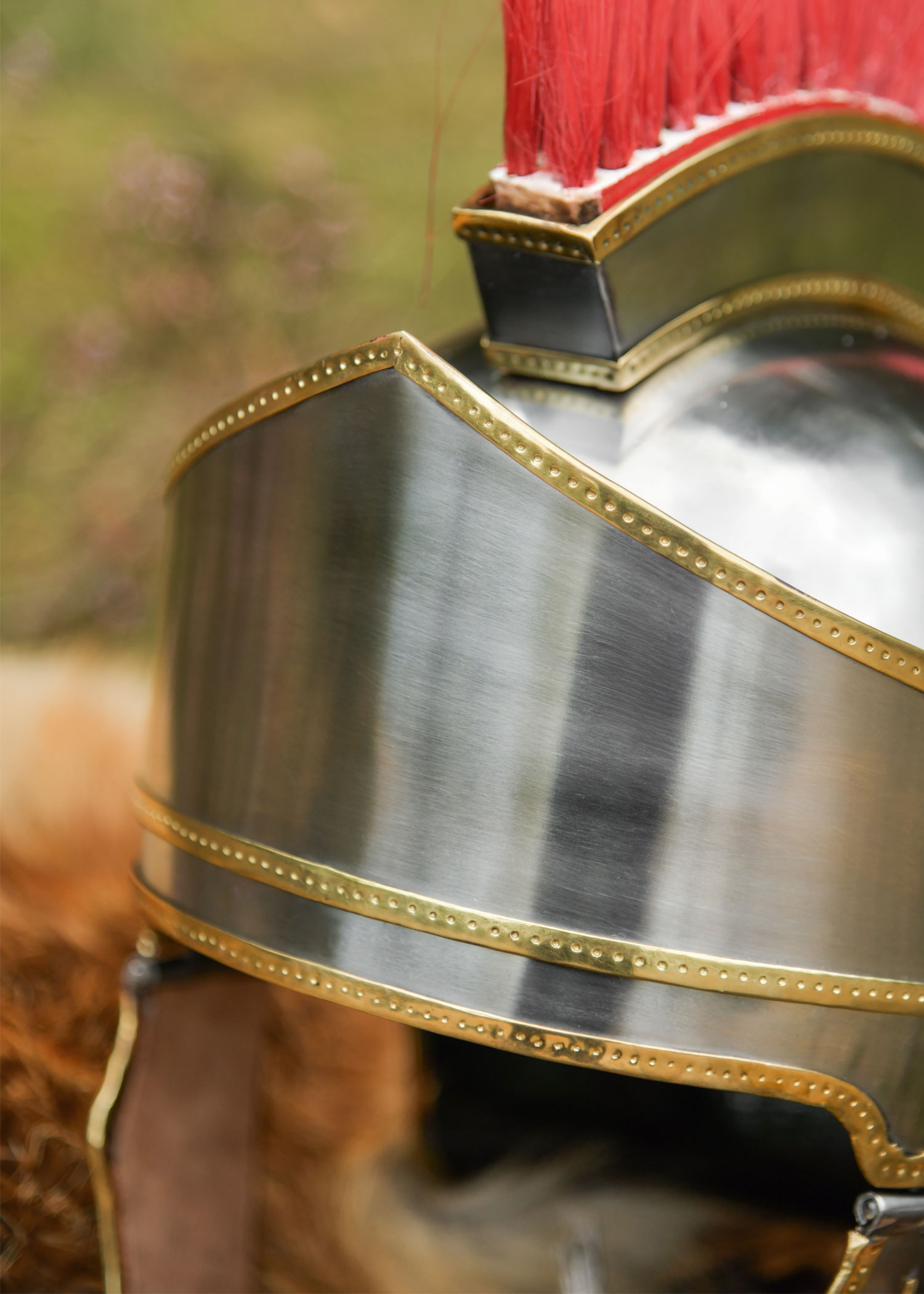 Elmo con paraguancie flessibili rivestite in pelle al suo interno. La cresta rossa può essere montata separatamente. Riproduzione tratta dai rilievi presenti sull'Arco di Costantino e che in origine facevano parte del grande fregio di Traiano. Esso raffigurava le gesta dell'imperatore Traiano al termine della conquista della Dacia, che culminava con un trionfo, quale continuazione del racconto del fregio colchide traianeo e il cui soggetto è riferibile, quindi, agli anni finali del 106-107. La Guardia pretoriana era un reparto militare dell'Impero romano che svolgeva compiti di guardia del corpo dell'imperatore. Dettagli: