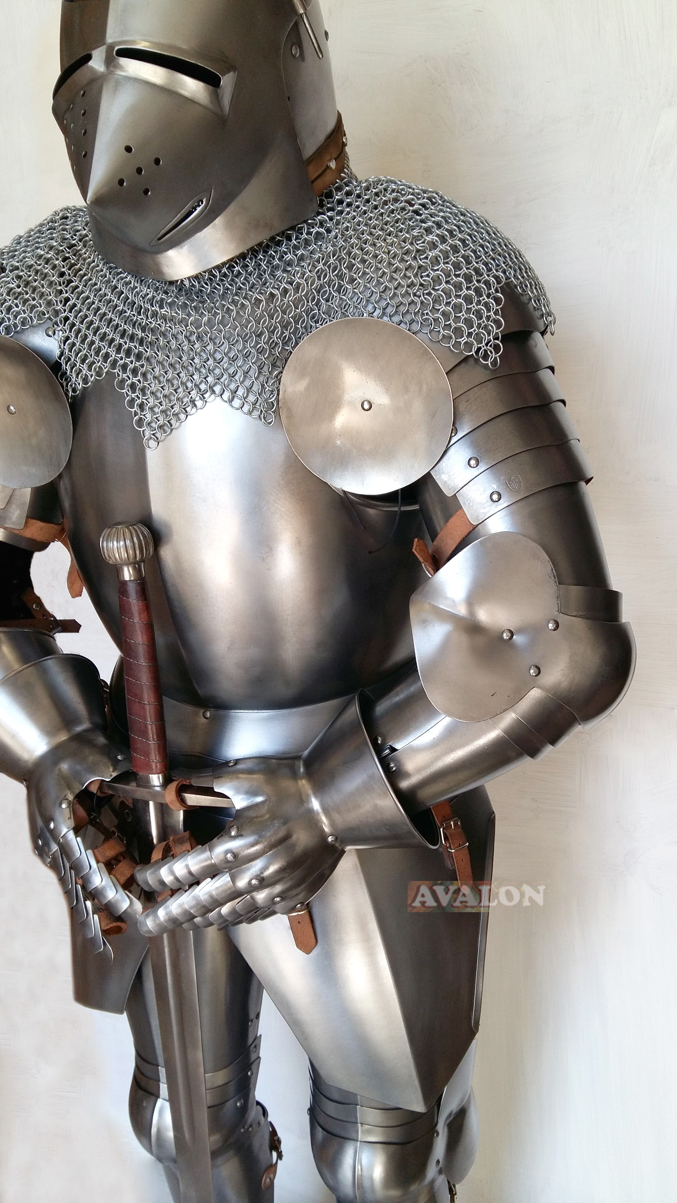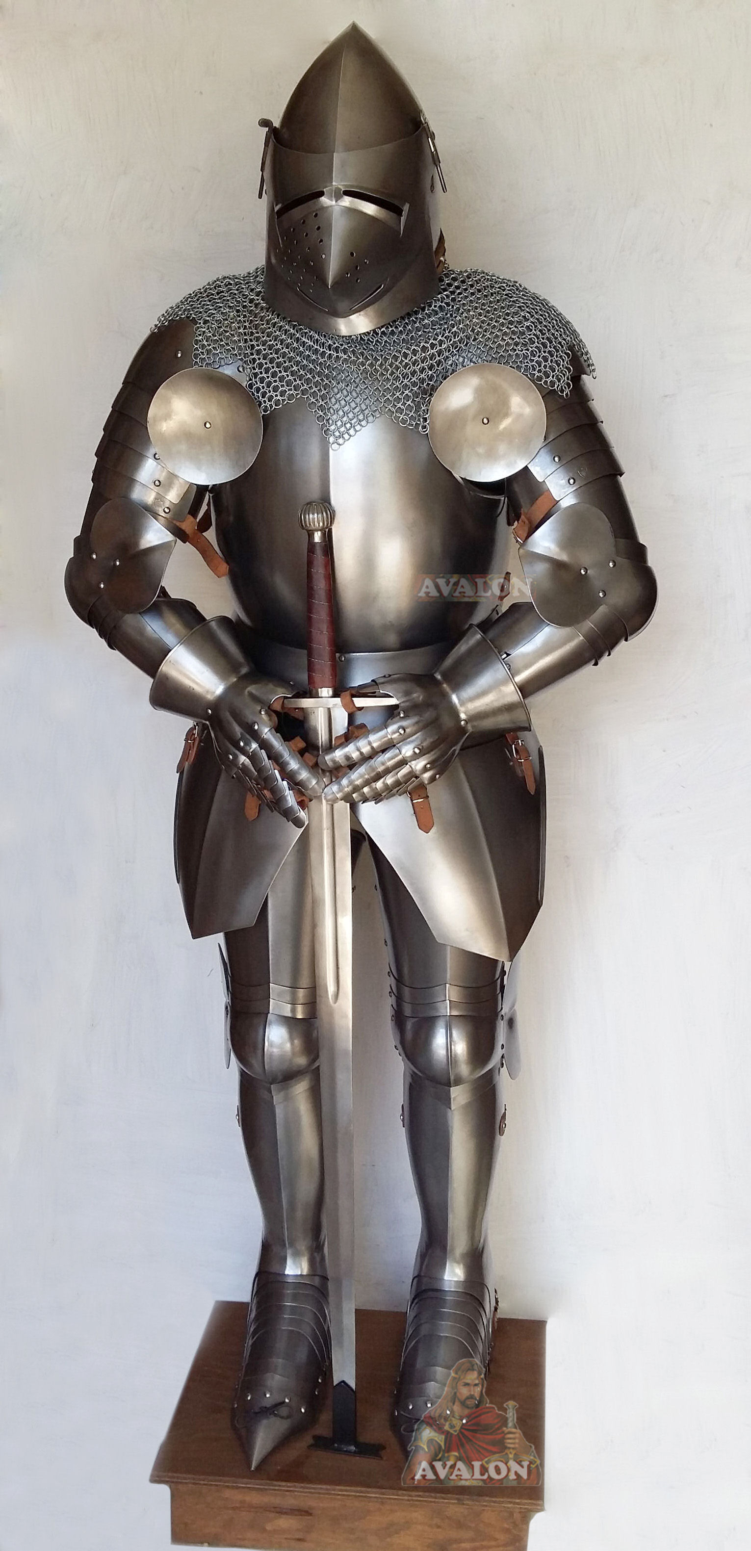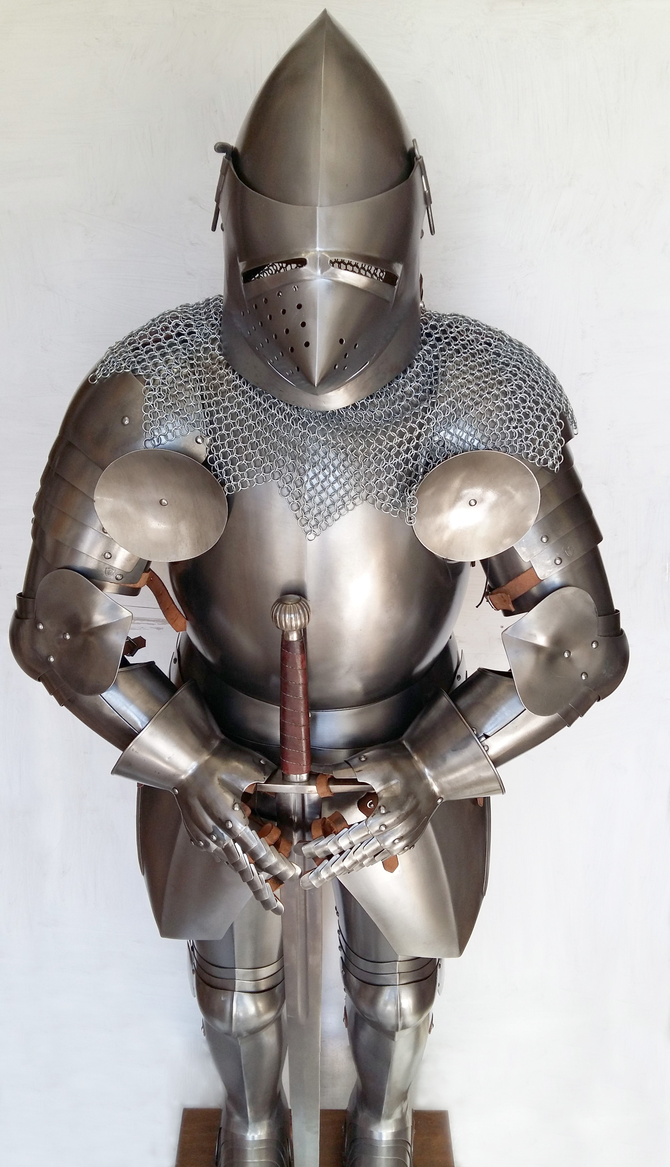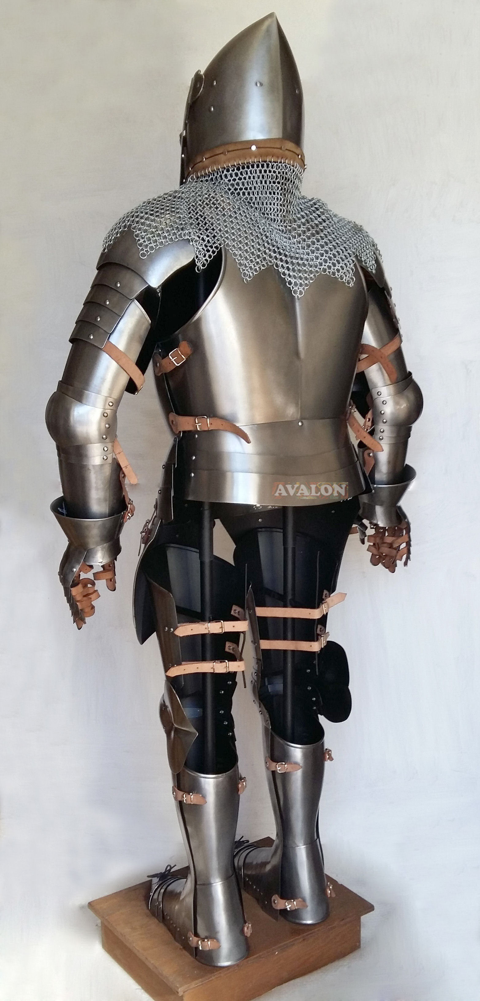 Armatura "all'italiana", caratterizzata da pezze dalla superficie liscia e tondeggiante e composta da un elmo Bacinetto con visiera "a muso di cane", sul margine inferiore esterno dell'elmo vi è una fascia di cuoio su cui è incernierato un camaglio di maglia metallica, a proteggere ulteriormente il collo e le spalle. Armatura fedele realizzata direttamente dall'originale. Armature di questo tipo venivano realizzate dai maestri armaioli milanesi nella prima metà del 1400, commissionate da nobili e condottieri da tutta Europa.