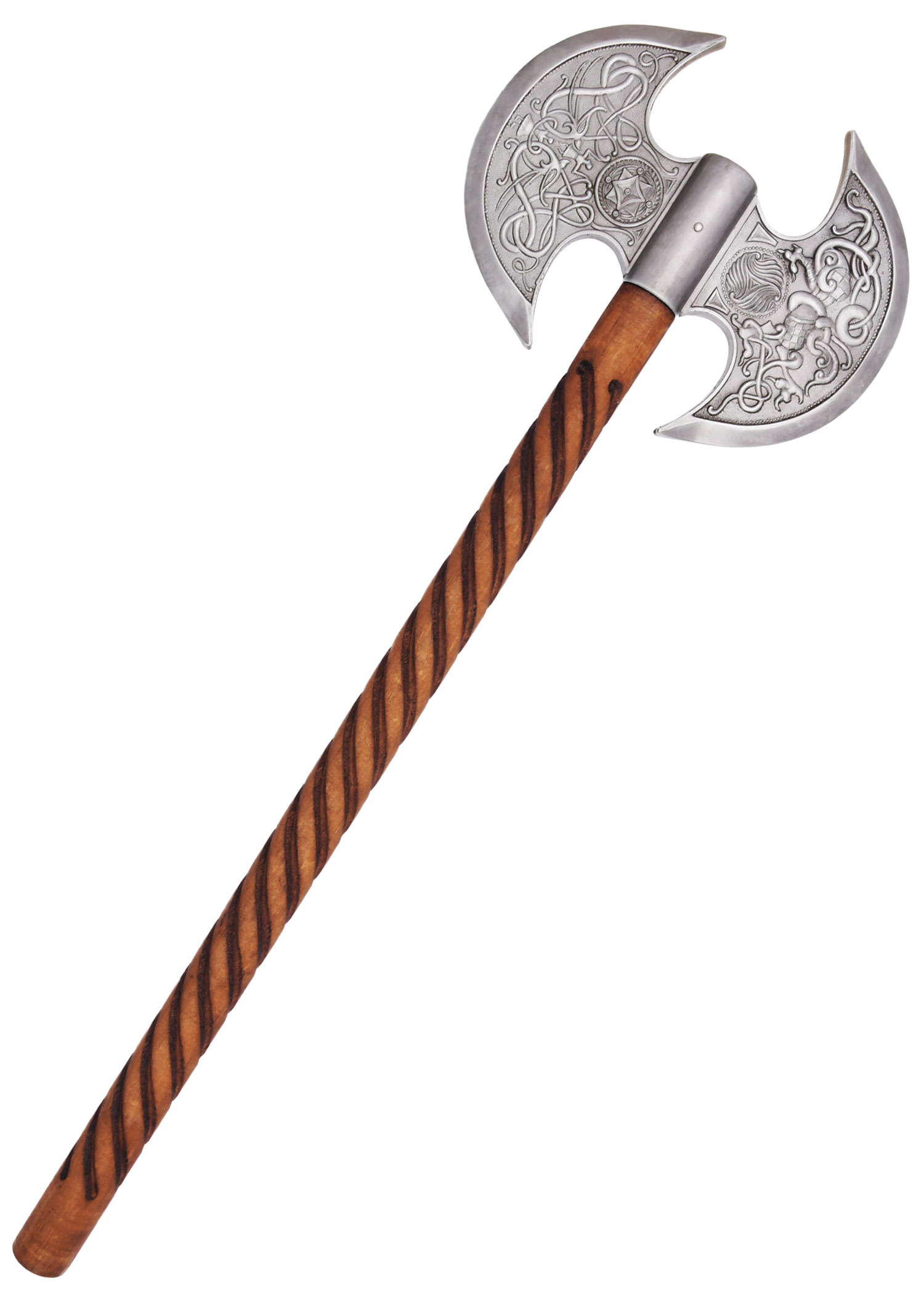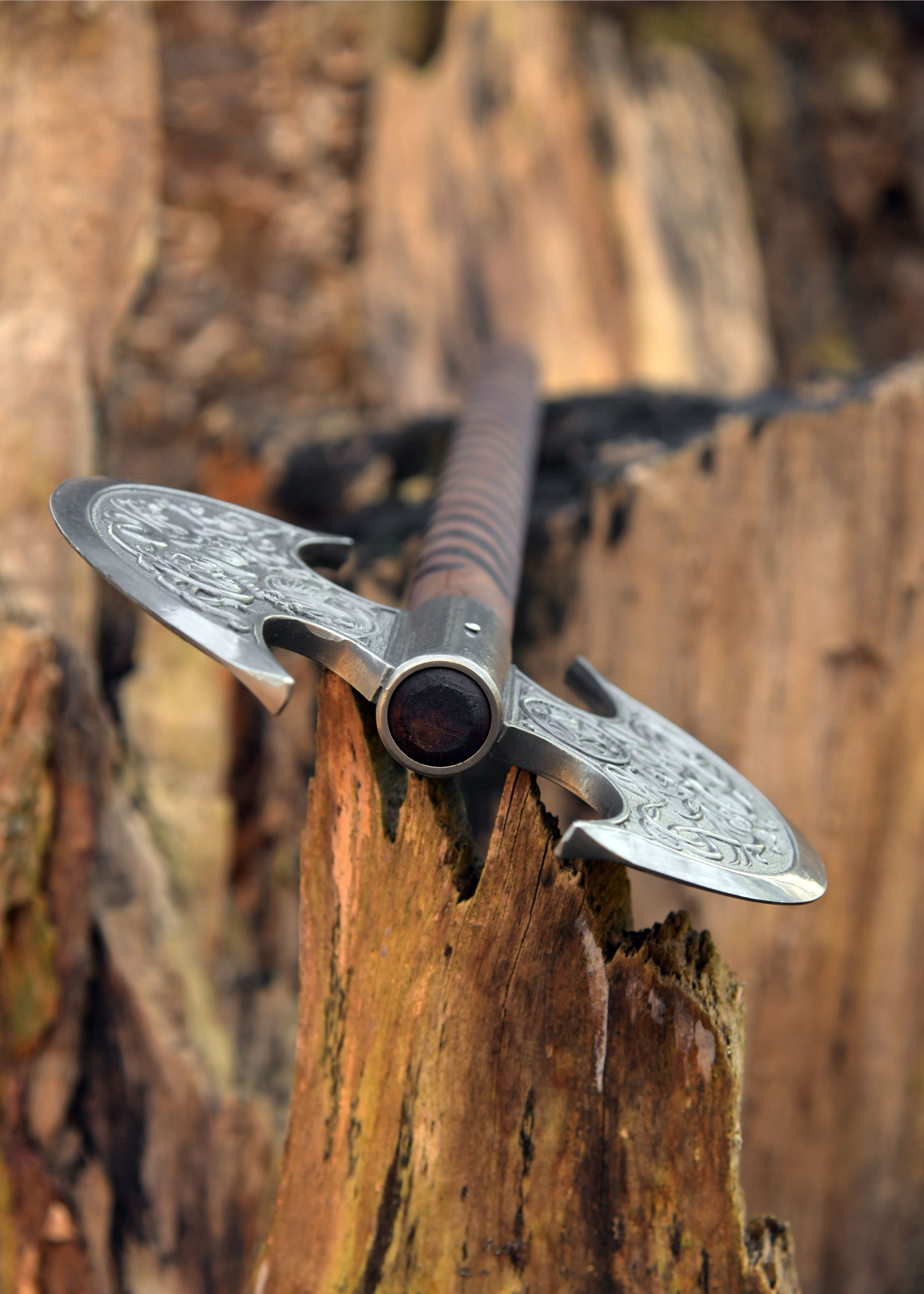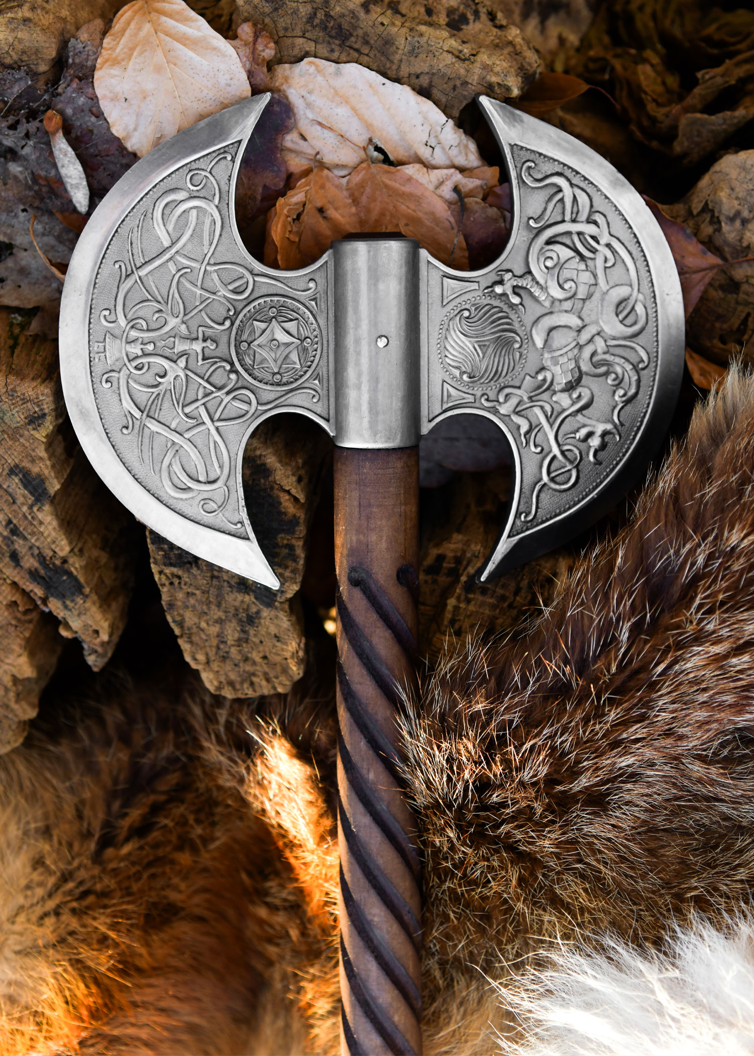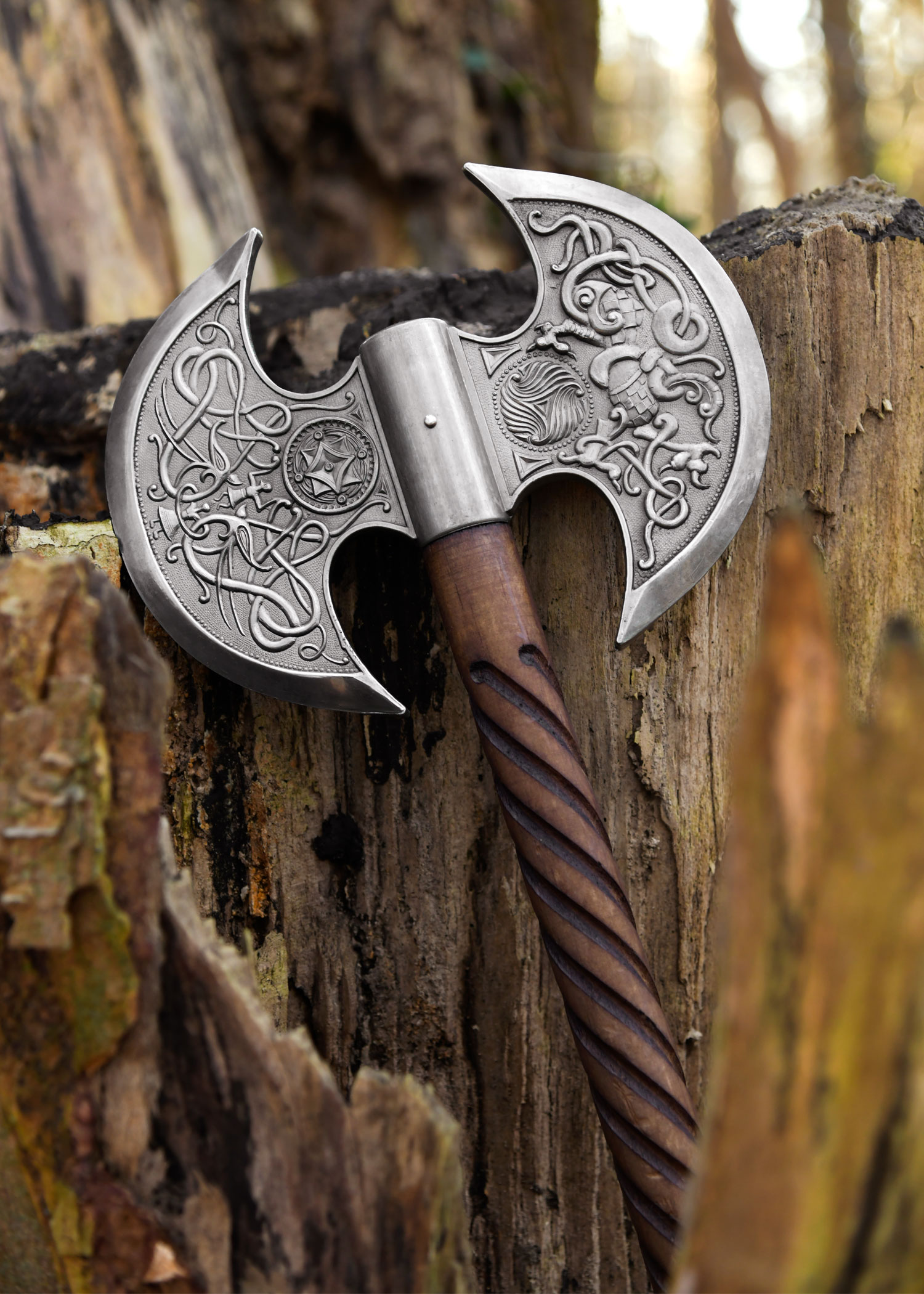 Ascia doppia medievale, Marto Ascia da battaglia di alta qualità ed elaboratamente decorata di Marto da Toledo. La lama dell'ascia è in acciaio inossidabile e incisa. Questo autentico oggetto da collezione è basato su un modello antico ed è un'impressionante decorazione per ogni collezionista.