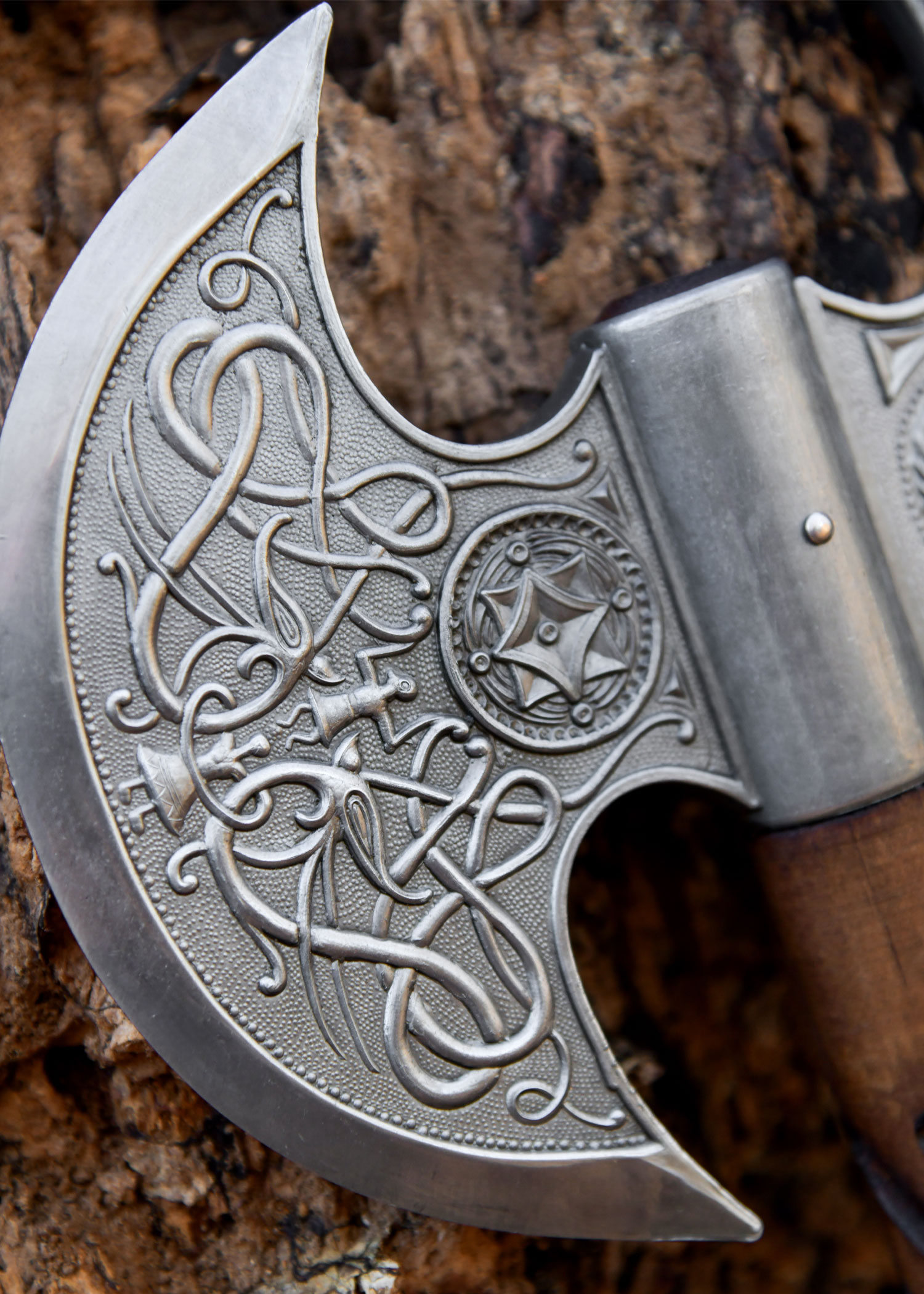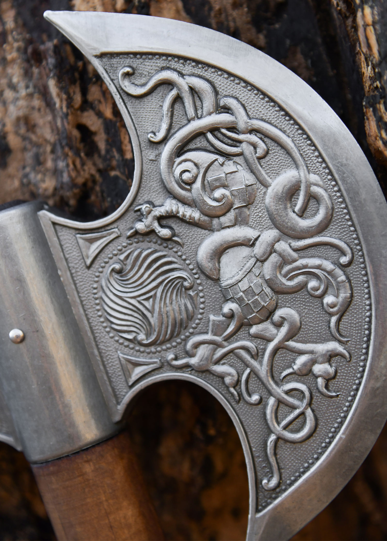 Ascia da battaglia di alta qualità ed elaboratamente decorata di Marto da Toledo. La lama dell'ascia è in acciaio inossidabile e incisa. Questo autentico oggetto da collezione è basato su un modello antico ed è un'impressionante decorazione per ogni collezionista.