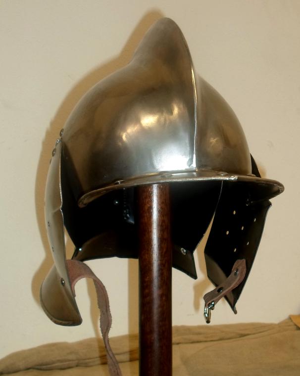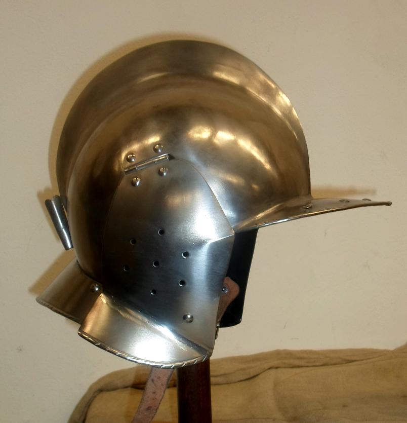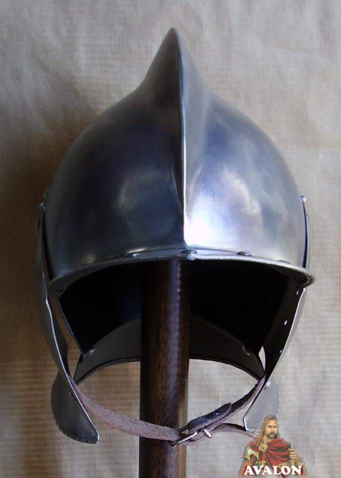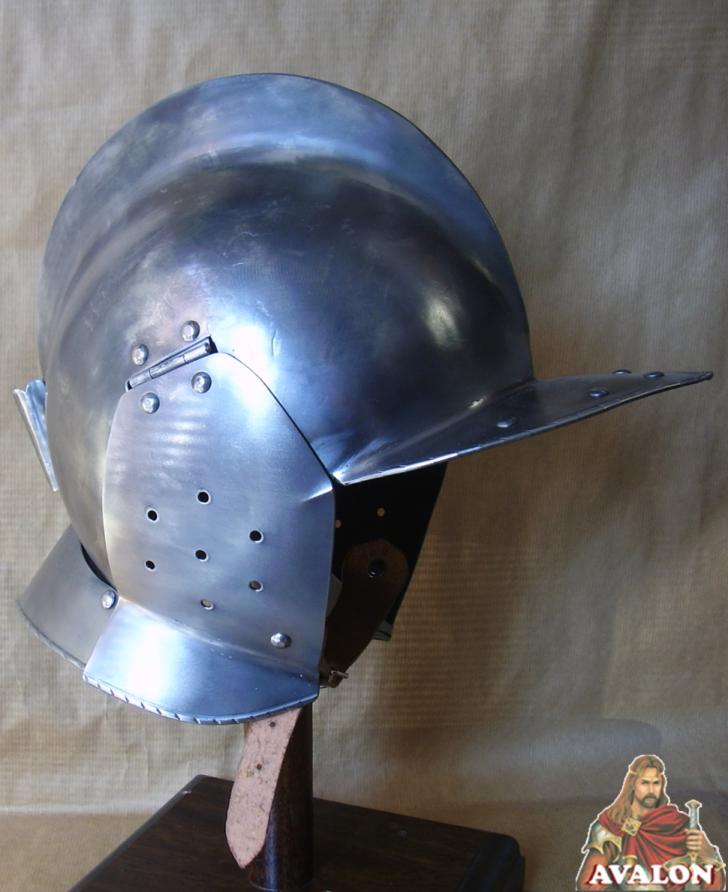 Elmetto da cavallo chiamato borgognotta è un tipo elmo con copricapo viso scoperto, caratterizzato dal coppo crestato (più o meno pronunciato, a seconda dei modelli), tesa, gronda e guanciali incernierati. L'elmo Borgognotta deriva molto probabilmente dall'elmo bizantino come protezione della testa in dotazione alle forze di fanteria durante gli assedi. Elmo sviluppato dal Cappello D'Arme del Tardo Medioevo, come "Elmo Morione" e il "Cabasset". Elmo diffuso nel secolo XVI in poi nelle forze di cavalleria pesante. Questa riproduzione di elmo Borgognotta è indossabile, personalizzabile in dimensioni e spessore: (1 mm - 2 mm). Elmo è l'ideale per il combattimento, ma anche per spettacoli di rievocazione medievali. L'interno dell'elmo presenta una cuffia in cuoio regolabile per essere indossato, l'elmo ha una sottogola in cuoio e fibbia in ottone. Dettagli: