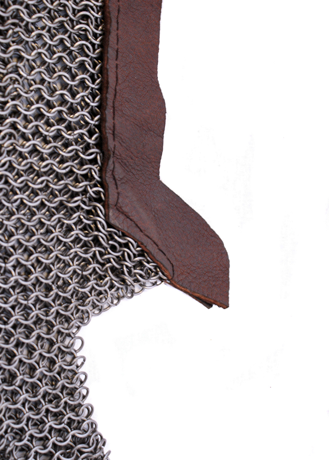 Cotta di maglia in acciaio per molle, ID 8mm - Adatto per combattimenti espositivi - Un aventail è una cotta di maglia che nel Medioevo veniva attaccata a un elmo per proteggere ulteriormente il collo e le spalle. I tipi di elmo preferiti in questo caso erano l'elmo nasale, ma soprattutto il bacinetto tardo medievale. Questa cotta di maglia di Ulfberth presenta un autentico bordo intrecciato frastagliato e una striscia cucita di spesso cuoio. Il cliente dovrà praticare i fori di fissaggio per l'elmo su queste strisce di pelle. Grazie al suo rapporto qualità-prezzo, è ideale per una buona protezione. L'intreccio è 4 in 1. Chiamiamo questo tipo di intreccio BTW (Butted Tensile Wire). Gli anelli non sono trattati, quindi potrebbero arrugginire, ma conferiscono all'intreccio un aspetto autentico. Dettagli:
