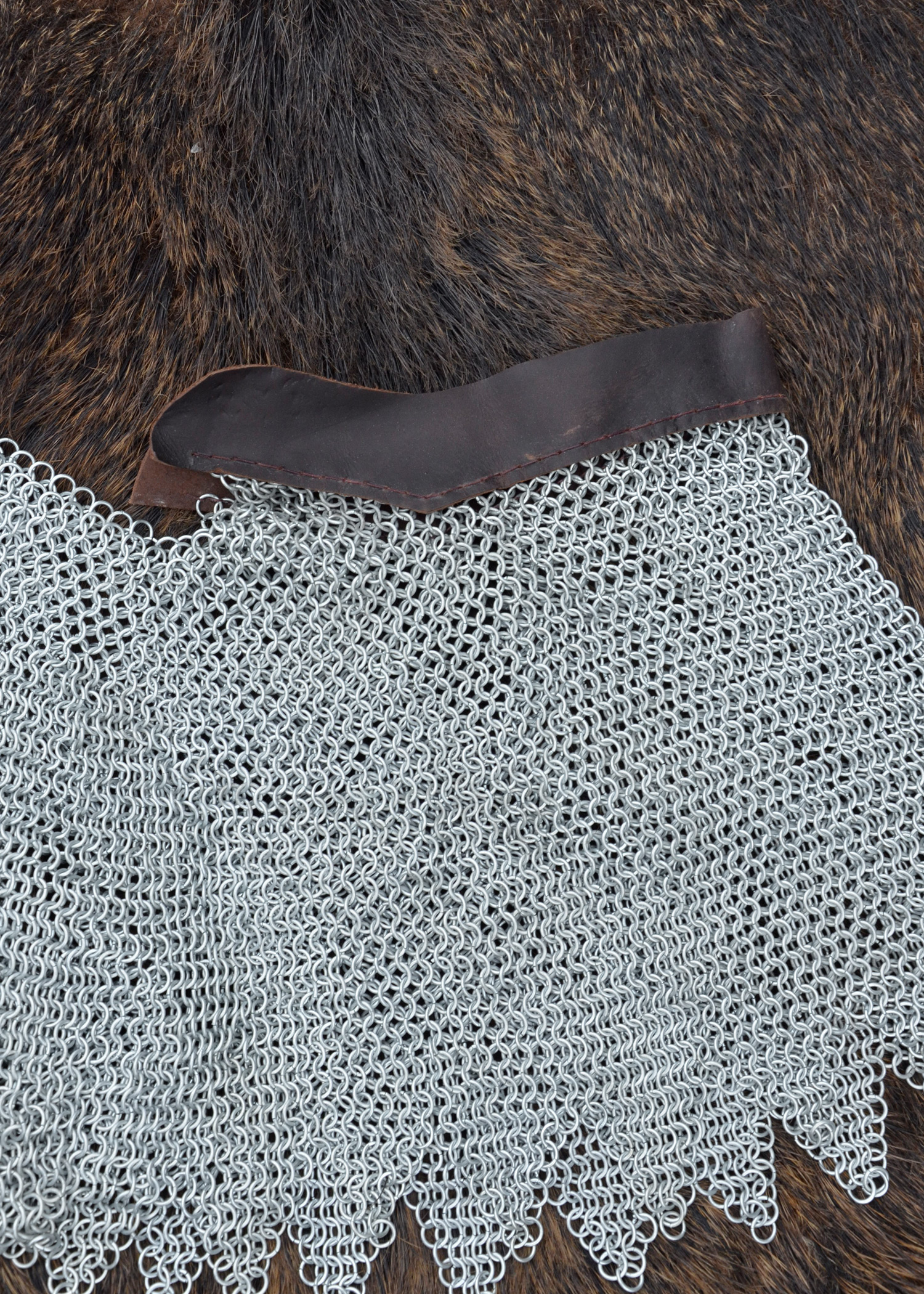Un aventail è una cotta di maglia che nel Medioevo veniva attaccata a un elmo per proteggere ulteriormente il collo e le spalle. I tipi di elmo preferiti in questo caso erano l'elmo nasale, ma soprattutto il bacinetto tardo medievale.Questa cotta di maglia presenta un autentico bordo intrecciato frastagliato e una striscia cucita di spessa pelle. Il cliente dovrà praticare i fori di fissaggio per l'elmo su queste strisce di pelle.