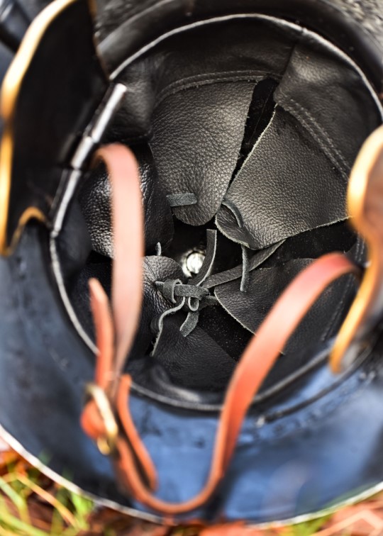 Elmo celtico Replica di un elmo celtico utilizzato dai guerrieri gallici del I secolo d.C. Il prototipo di questo elmo è stato scoperto durante gli scavi nella foresta "Forêt de Rouvray" nel nord della Francia. Probabilmente il crine di cavallo era attaccato alla visiera dell'elmo. Dettagli: