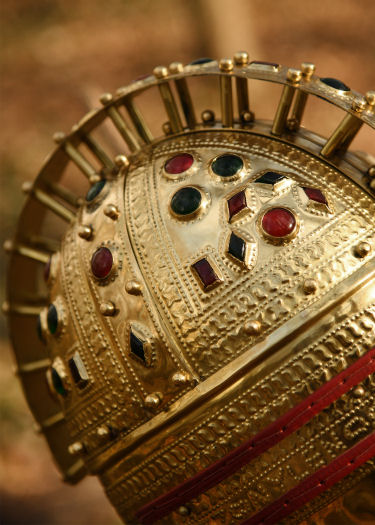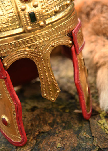Il nostro elmo presenta un inserto in pelle rossa cucita e gli ornamenti sono in vetro. L'elmo è imbottito sia sui paraguance che sul paranuca.