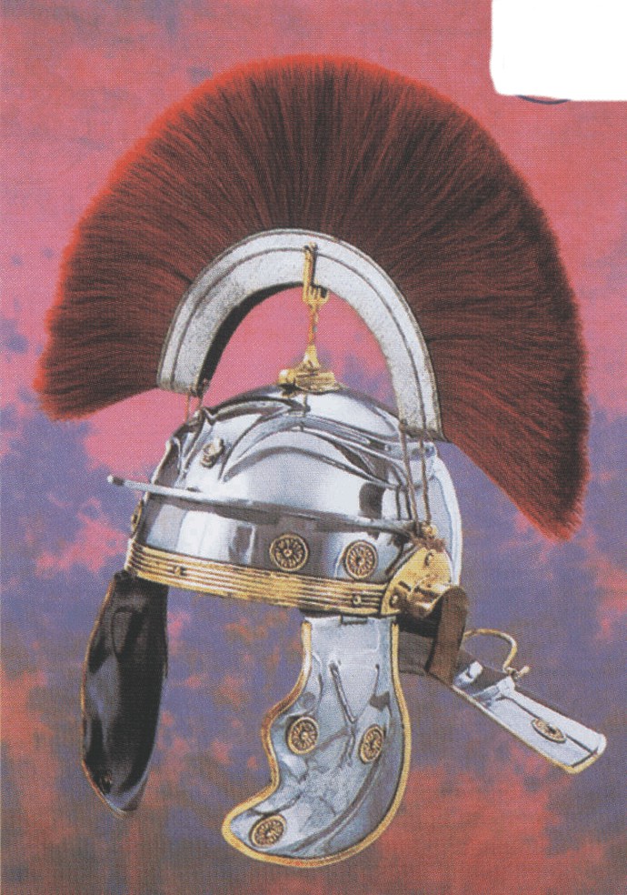 Elmo romano di tipo "Imperiale Gallico" della metà del I secolo d.C. sormontato da una cresta in crine di cavallo rosso distintiva del rango di centurione e posta su un cimiero inserito trasversalmente sul coppo tramite un sostegno a forchetta ricostruito con precisione come nell'originale. Elmo imperiale gallico - G - Weisenau, acciaio. Elmo romano con stemma del centurione romano, elmo indossabile. Realizzato interamente in acciaio con parti metalliche decorative in ottone. L'originale è stato trovato vicino a Weisenau, in Germania. Incluso è un cappuccio imbottito. Incluso pennacchio di crine e supporto in ottone. Dettagli: per circonferenze della testa fino a 60 cm lunga distanza (fronte-retro): ca. 21,5 centimetri breve distanza (da orecchio a orecchio): ca. 19 cm Peso: ca. 1,5 kg.