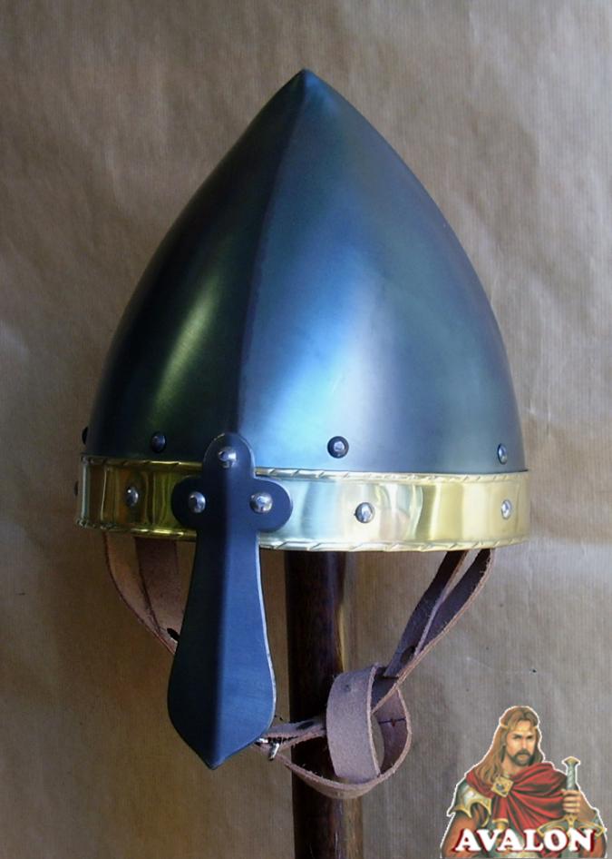 Elmo da combattimento della prima metà del secolo XI, riprodotto secondo fonti iconografiche., elmo di solito indossato sopra un camaglio ad anelli per la protezione integrale della testa. Questo elmo è l'ideale per il combattimento, ma anche per spettacoli di rievocazione medievali. elmo da combattimento, riprodotto secondo fonti storiche. Elmo utilizzato da guerrieri normanni che si insidiarono nel Sud dell'Italia fino alla Sicilia. Si distinguono per la forma a punta piegata in avanti che ricordano forme antiche di elmi. L'interno dell'elmo presenta una cuffia in cuoio regolabile per essere indossato, l'elmo ha una sottogola in cuoio con fibbia in ottone. Dettagli:
