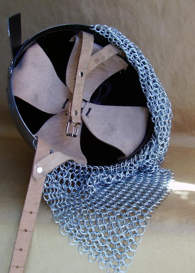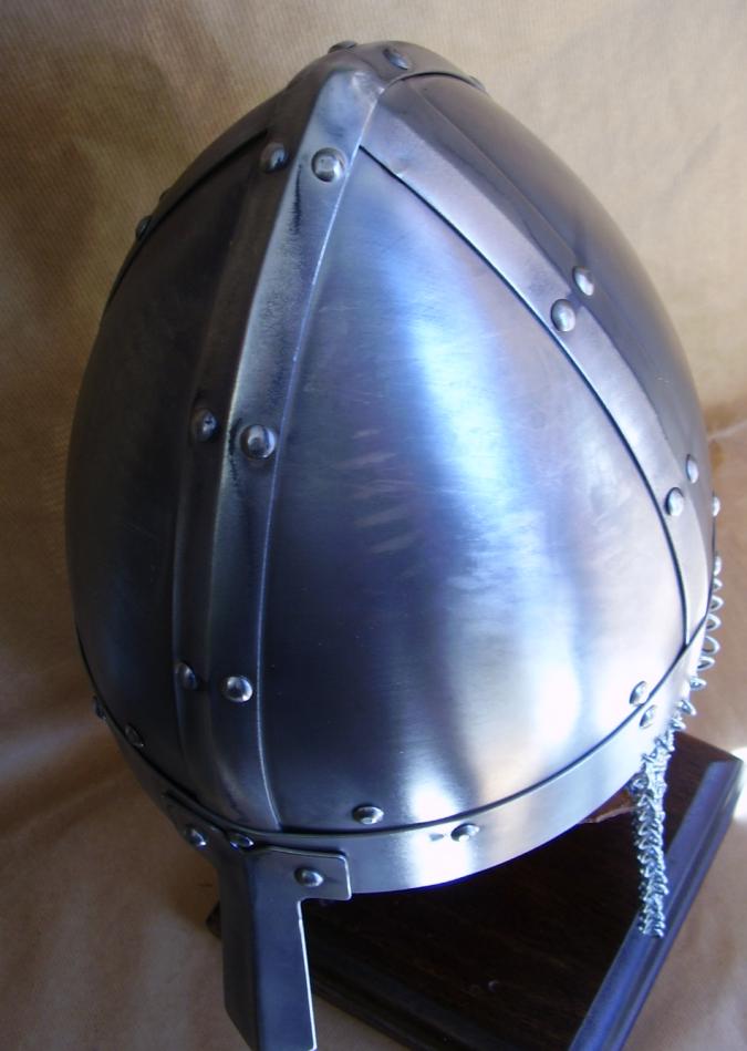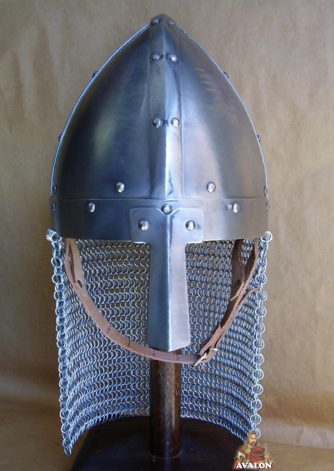 Riproduzione di un Elmo Normanno con nasale rivettato del tipo Spangenhelm. Elmo Normanno a nasale provvisto di maglia di ferro ad anelli zincati per proteggere la parte posteriore del collo.