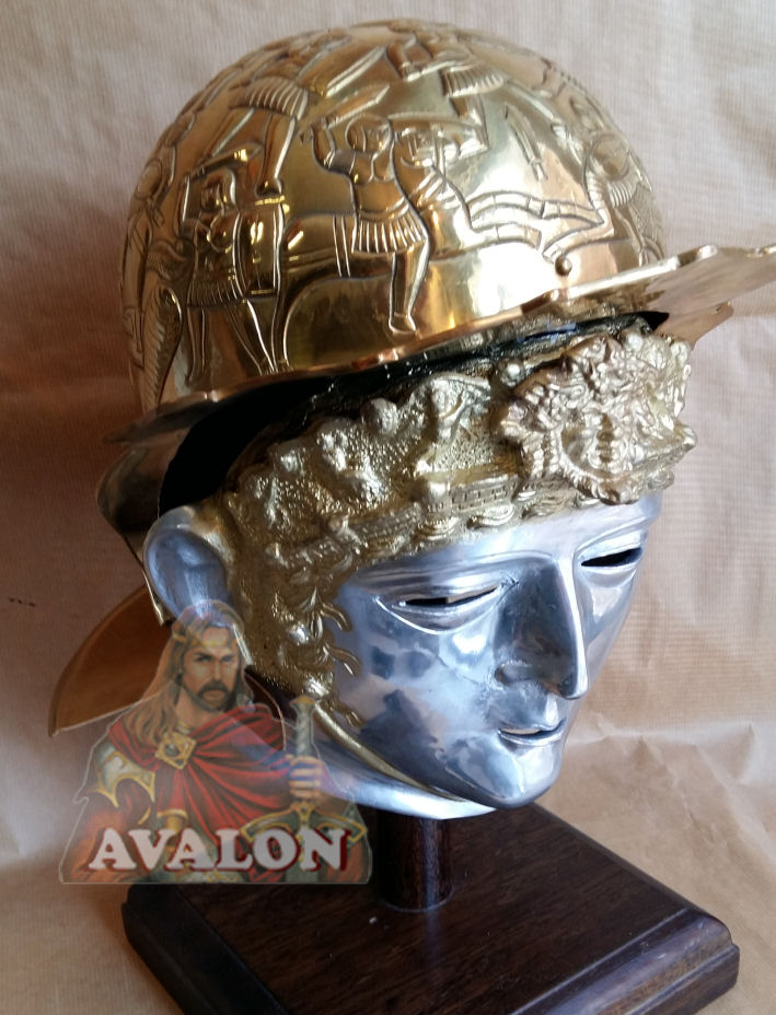 Elmo romano Ribchester realizzato interamente in metallo ottonato lavorato a mano, stagno fuso e sbalzato la maschera.