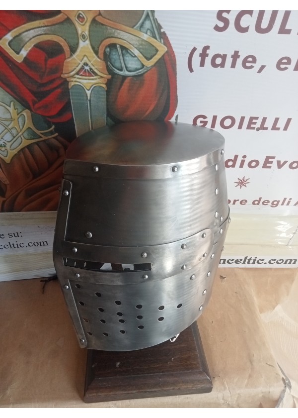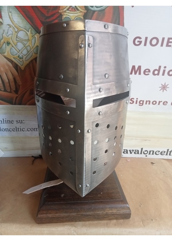 Riproduzione di un Elmo Templare del tipo Grande Elmo, si tratta di un elmo Pentolare in acciaio utilizzato durante le crociate nel XII° secolo. Elmi di questo tipo furono indossati in combinazione con un camaglio in maglia di ferro.
