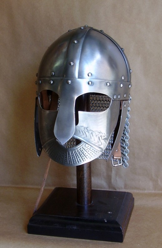 Elmo Vichingo - Normanno semisferica, con maschera facciale in metallo a protezione degli occhi e del naso ma anche per includere la paura all'avversario, realizzato in acciaio lavorato a mano con l'applicazione di un camaglio, calotta di cuoio regolabile per migliorarne la comodità, inoltre tutte le parti in metallo sono rivestite internamente in cuoio.