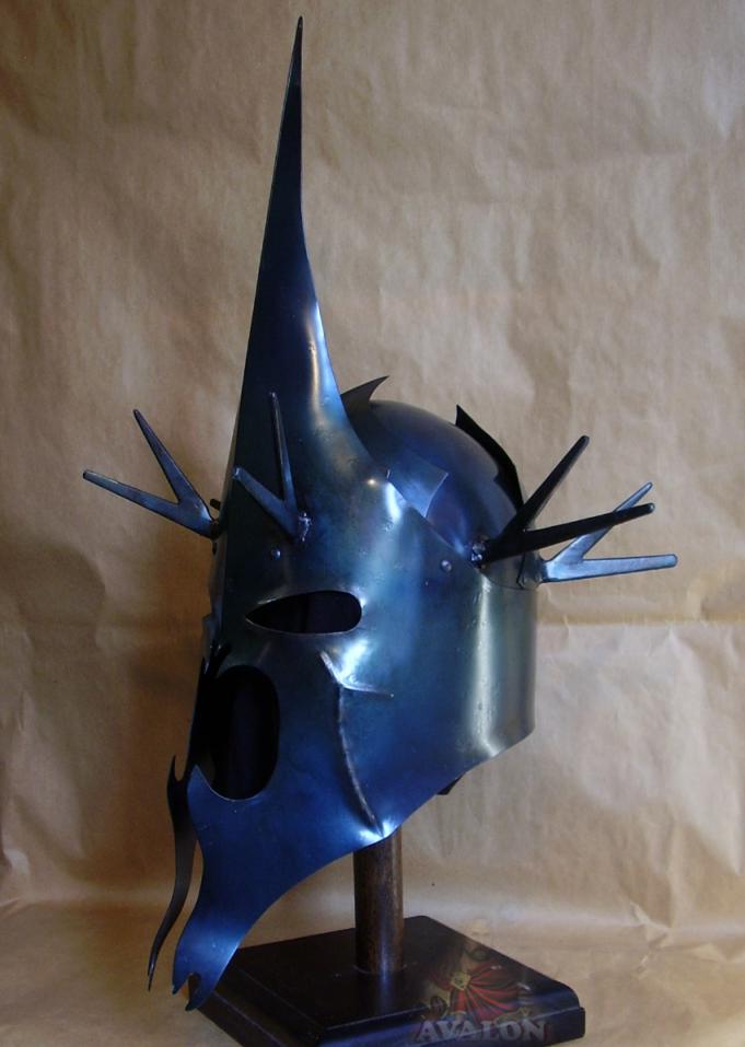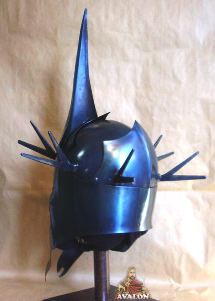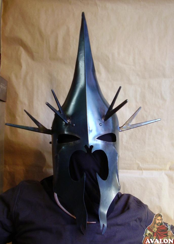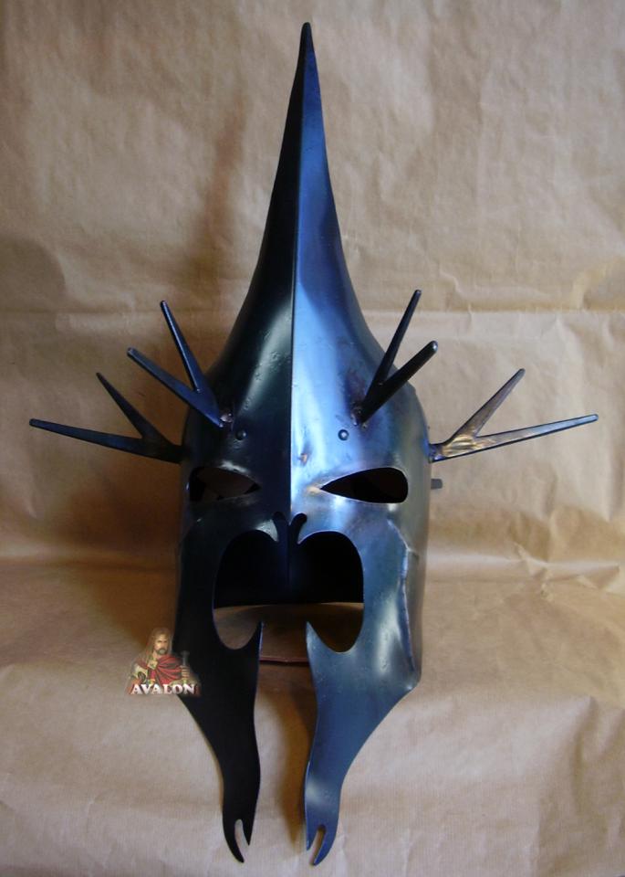 Riproduzione autentica dell'Elmo Re stregone. Re Stregone è un personaggio della Terra di Mezzo dello scrittore inglese J.R.R. Tolkien, appare in particolare nel romanzo Il Signore degli Anelli. E 'il capo dei nove Spettri dell'Anello, il Re Stregone ha svolto un ruolo importante durante la Guerra dell'Anello, in quanto comandava le truppe che dovevano attaccare Gondor. Il Re Stregone come gli altri otto Nazgûl, non possiede più un corpo visibile, avendo portato ed usato con avarizia e malvagità per lungo tempo uno dei "Grandi Anelli" di Sauron, e per tale motivo, per rendersi visibile ai suoi servitori e alle sue spie, è costretto ad indossare un grande manto nero che riesce a dare forma al suo corpo invisibile di spettro. Il Re degli Stregoni di Angmar il più alto dei "Nove", con un unico abito lungo e grigio, porta un elmo nero sul quale è posta una corona, la sua mano brandisce una lunga spada d'acciaio.