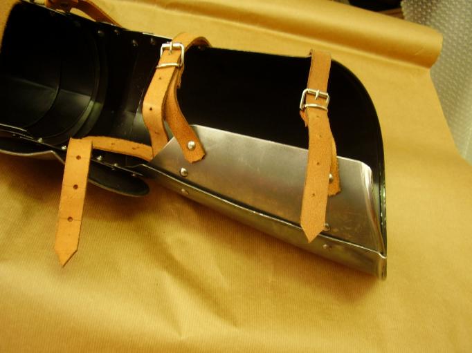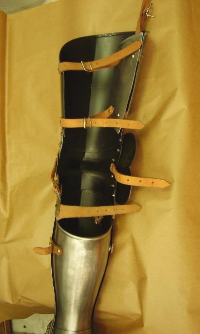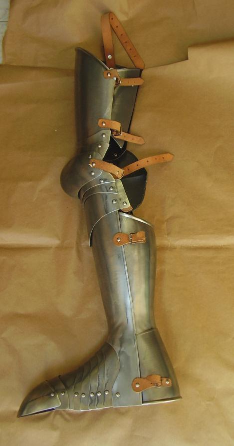 Completa di cosciale, ginocchietto con aletta, schiniere e scarpa. Realizzata in ferro spazzolato con coietti in pelle.