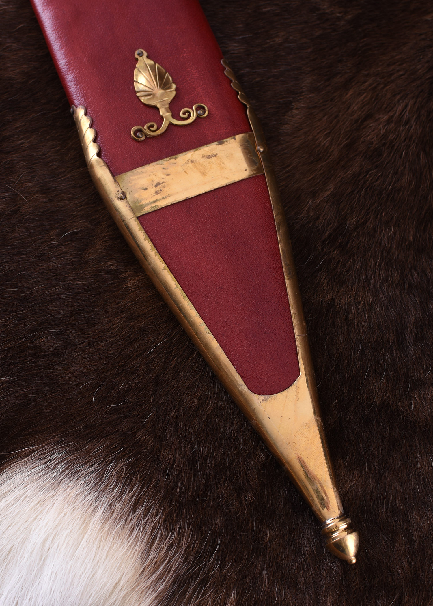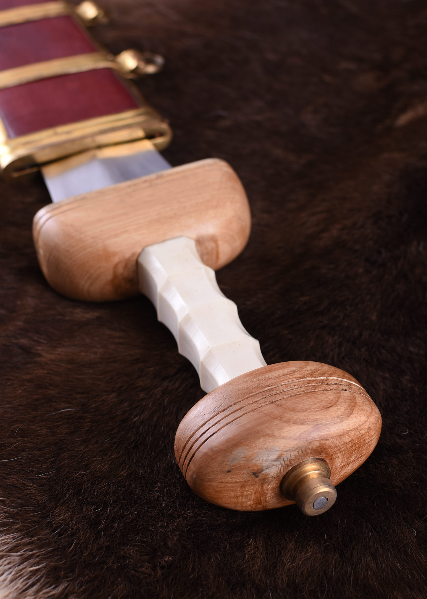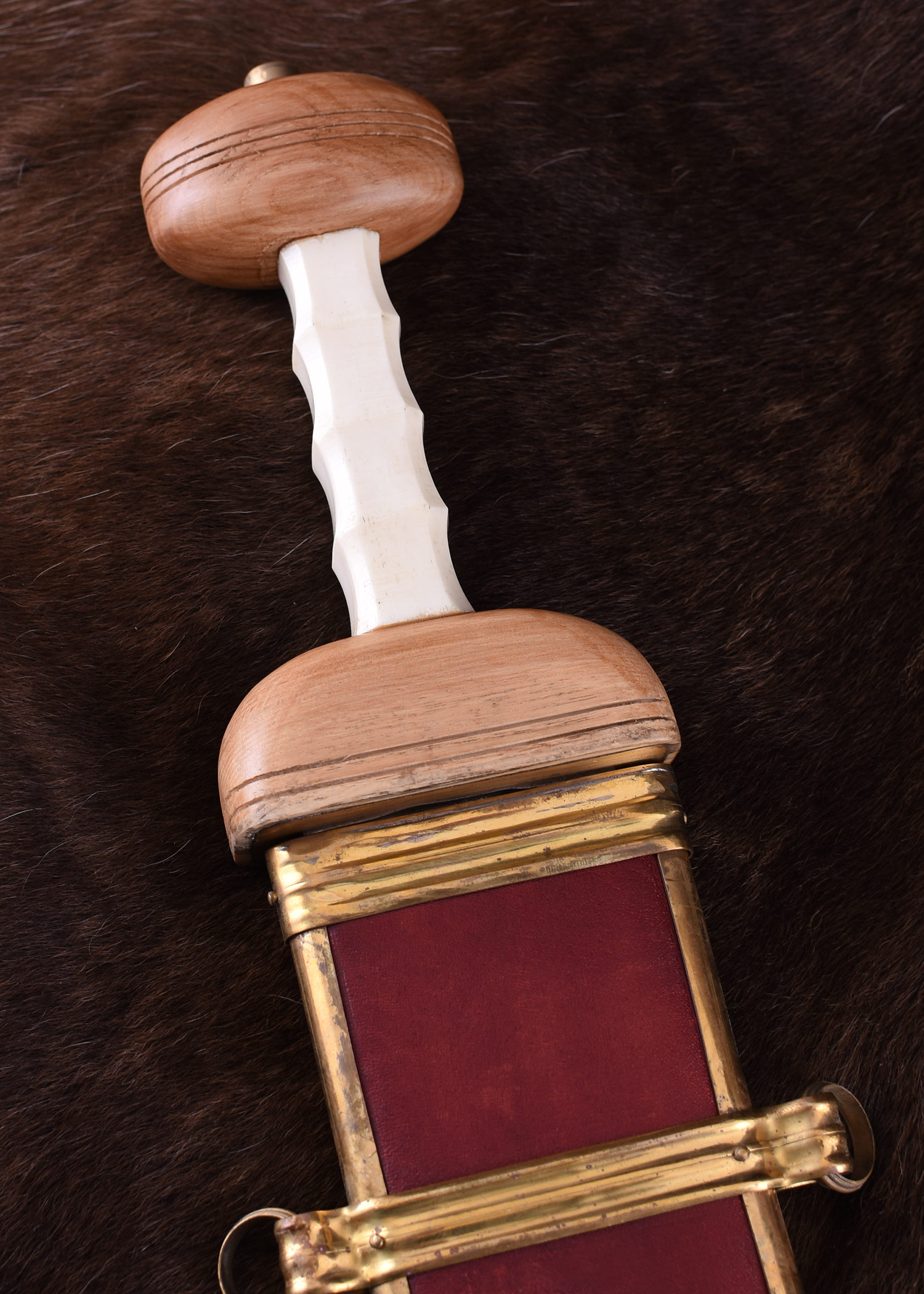 Il gladio romano a una mano è fornito con un fodero in legno rosso e cuoio con finiture in ottone (una fascia per la bocca, tre fasce orizzontali, finiture per il bordo e un puntale a V decorato con una palmetta e rifinito con un pomolo). Anelli di trasporto in ottone sono fissati alle due fasce superiori, permettendone il trasporto proprio come un vero legionario romano.